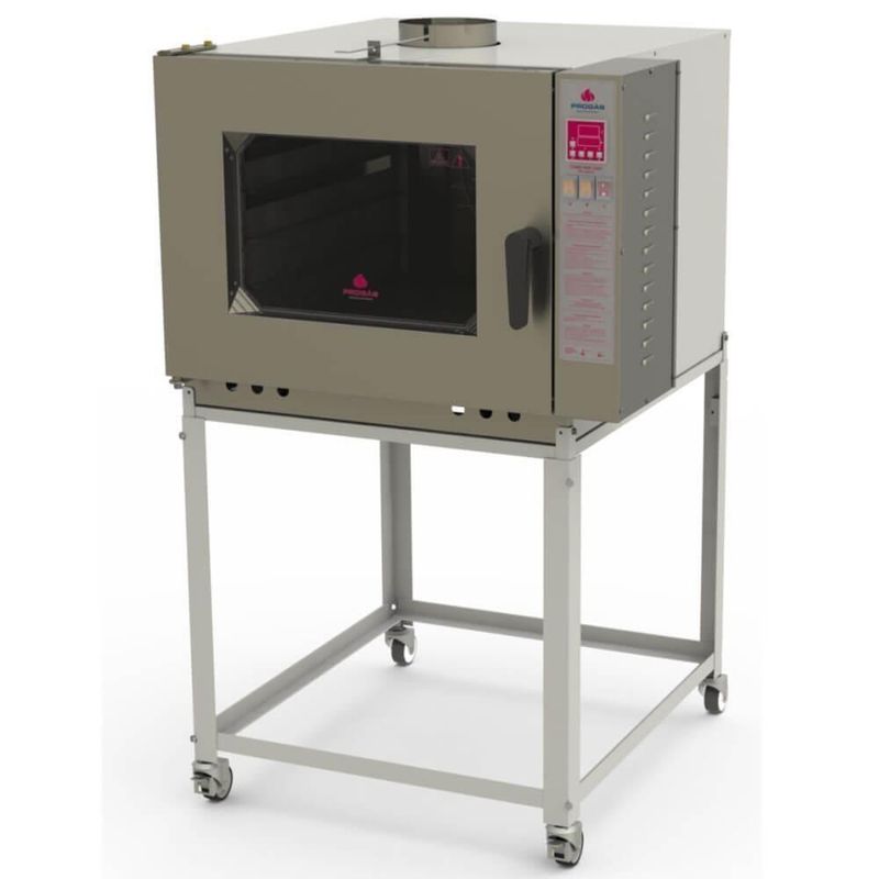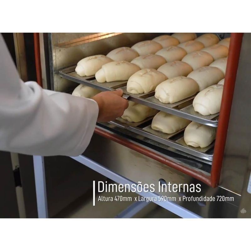 Forno Turbo Industrial Progás A Gás Prp-5000 Nl New Light Com Vapor BivoltFORNO TURBO INDUSTRIAL PROGÁS A GÁS PRP-5000 NL NEW LIGHT COM VAPOR PARA 5 ESTEIRAS BIVOLT P36227Marca: ProgásModelo: A Gás PRP-5000 NL New Light Com Vapor Para 5 Esteiras Bivolt P36227OBS: não acompanham as esteiras.DESCRIÇÃO- Este equipamento é utilizado para produção de pães e doces, proporcionando um cozimento uniforme.- Projetado com sistema de gaveta fixa de aquecimento com circuito (GLP) gás em baixa pressão e sistema integrado de aquecimento, que proporciona maior , baixo consumo, facilidade de manuseio, praticidade na manutenção e eficiência no trabalho.- Capacidade de cozimento: 5 esteiras de 580 x 700 mm com 25 pães de 50 g cada, totalizando 125 pães por fornada. Em uma hora, produz 375 pães de 50g. Obs.: O espaço entre as esteiras deve ser de 85 mm a 105 mm.INFORMAÇÕES GERAIS- Fabricado em chapa com pintura epóxi- Frente, painel e porta em inox- Tempo de aquecimento: até 200° C de 14 a 22 minutos- Tempo de cozimento: de 15 a 20 minutos para pães de sal (francês)- Motor: monofásico 1/4 CV- Pressão hidráulica: 19,6 a 784 kPa- Potência: 381/363 W- Consumo elétrico: 0,34 kW/h- Consumo médio de gás: 0,9 Kg/h- Câmara interna com acabamento com pintura alta temperatura resistente a oxidação- Capacidade da fornada: 125 unidades de 50g- Acabamento frontal em aço inox escovado- Porta com visor em vidro temperado- Iluminação interna com proteção de vidro resistente a altas temperaturas e choques térmicos- Isolamento interno com lã basáltica- Liga e desliga a turbina automaticamente ao abrir e fechar a porta- Rodízios que facilitam o deslocamento- Tensão 127/220v (Bivolt)- Frequência: 50/60 Hz- Baixo consumo de gásPESO- 128 Kg.GARANTIA- 6 mesesDIMENSÕES- Medidas Totais (AxLxP): 1530 x 910 x 1230 mm;- Medidas Internas (AxLxP): 470 x 580 x 720 mm;- Peso Líquido: 135 Kg; Quantidade de prateleiras: 0 | Quantidade de moldes: 5 | Marca: Progás | Peso Líquido: 155.0000 | Cubagem: 1.325610 | Dias Fornecedor: 0 | EmbalagemAltura-cm: 103 | Modelo: PRP-5000 NL | EmbalagemLargura-cm: 110 | Fonte de energia: Gás | Tipo de montagem: De pé | Quantidade de espetos: 0 | EmbalagemComprimento-cm: 117 | Função do forno: Assar | Tipo de cozimento: Industrial | Tipo de culinária: Industrial