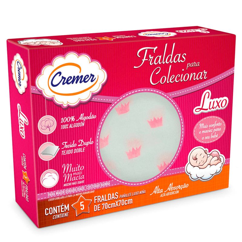 Fralda Cremer Luxo Estampa Feminina 5 UnidadesA Fralda Cremer Luxo Estampa Feminina é feita em tecido de algodão proporcionando todo cuidado e conforto para o seu bebê. Confeccionada com tecido duplo 100% de fibra de algodão, a Fralda Creme é macia e suave para evitar irritação ou incomodo a pele sensível e delicada do bebê. O pacote contém 05 fraldas de 70 x 70cm.