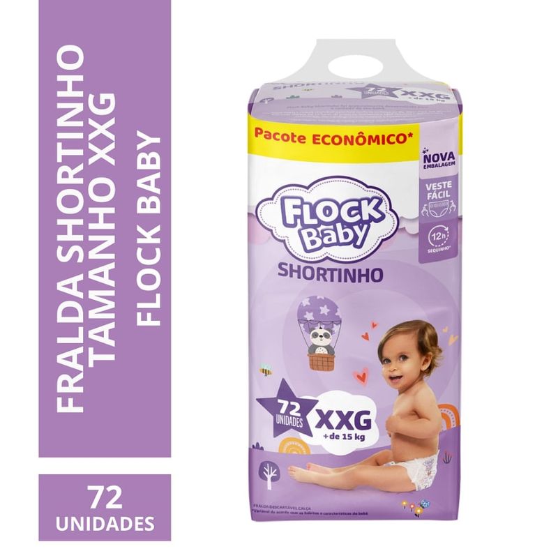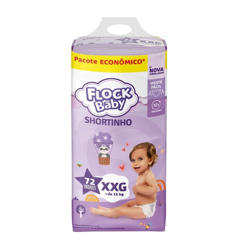 Fralda Descartável Flock Baby Shortinho Maxxi Bag XXG 72 Unidades A Fralda Descartável Flock Baby Shortinho Maxxi Bag XXG foi desenvolvida para oferecer máxima praticidade, conforto e segurança no cuidado diário do bebê. No moderno formato shortinho, veste como uma roupinha, facilitando a troca, principalmente em bebês mais ativos, e garantindo liberdade de movimentos em todas as fases do dia. Principais benefícios Formato shortinho: fácil de vestir e remover, como uma calcinha Ajuste anatômico confortável, que acompanha o crescimento do bebê Mais liberdade de movimentos, ideal para engatinhar, andar e brincar Proteção eficiente contra vazamentos, para uso diário Embalagem econômica Max, com alto rendimento Qualidade e confiança da marca Flock Baby Para quem é indicada Bebês no tamanho XXG, conforme indicação da embalagem Uso diurno ou noturno Ideal para rotinas agitadas, passeios e período de desfralde Como utilizar Vista a fralda como uma calcinha, ajustando corretamente ao corpo do bebê Após o uso, rasgue as laterais para facilitar a retirada Descarte adequadamente no lixo Produto de uso infantil, respeitando sempre o tamanho indicado. Instruções de armazenamento e segurança Manter em local seco, arejado e protegido da luz solar direta Manter fora do alcance de crianças quando fora do uso Produto de uso externo