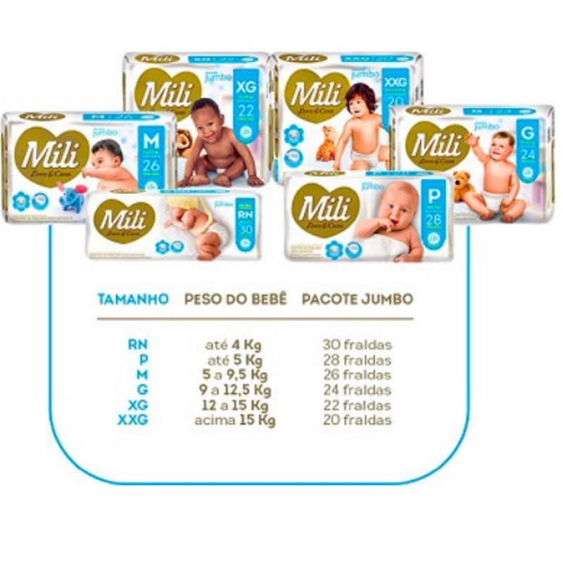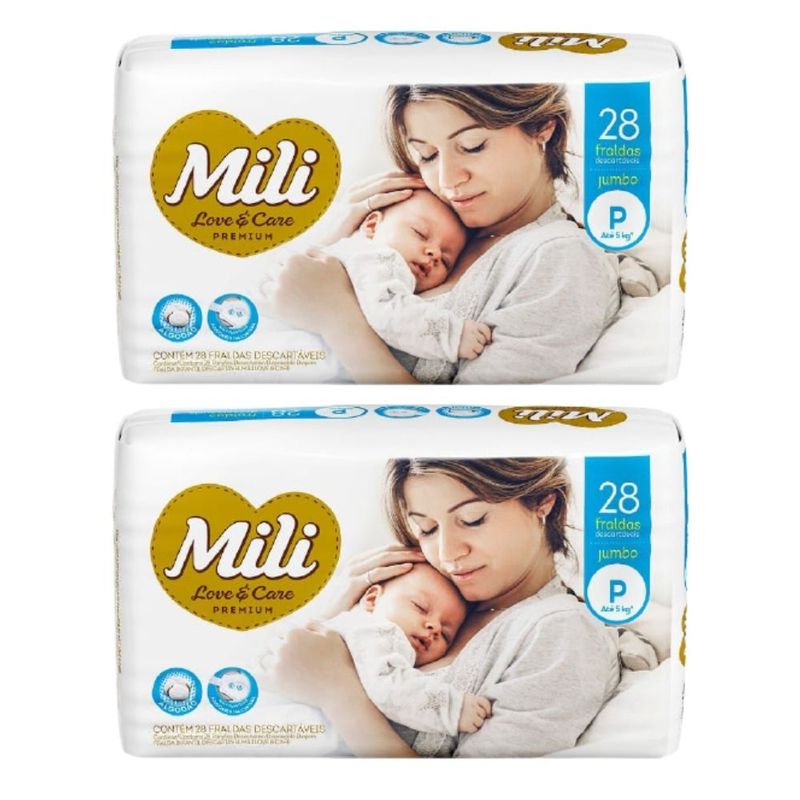 Fralda Descartável Mili - LoVe & Care - Linha Premiun - Tamanho P Quantidade: 2 pacotes contendo 28 fraldas (total: 56 fraldas) Tamanho P - (para bebês até 5 Kg). Fralda de altíssima qualidade que vai atender as expectativas de quem procura o melhor para o seu bebe: qualidade, conforto e praticidade, A Mili Love & Care é uma fralda que foi lançada para surpreender você.Com até 12 horas de proteção, ela oferece todo o cuidado e suavidade que seu filho precisa para ficar sempre sequinho e confortável. A pele respira mais, a fralda se ajusta bem e o bebê se sente melhor. -Toque macio-Gel absorvente- Abas elásticas- Com extrato de algodão - deixa a pele respirar- Máxima proteção - 6 camadas que deixam o bebê protegido e sequinho