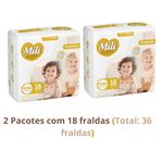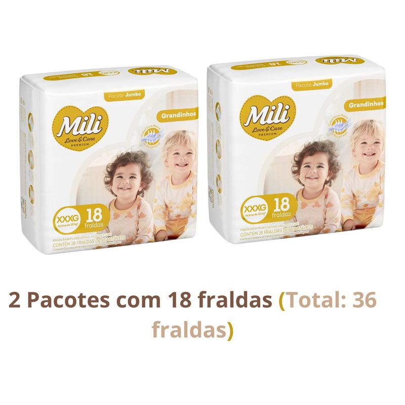 Fralda Descartável Mili Love & Care Linha Premium Tamanho: XXXG (indicado para bebês acima de 18 kg - Grandinho) Quantidade: 2 Pacotes com 18 fraldas (Total: 36 fraldas) Marca: Mili Fralda confeccionada pela moderna tecnologia Mili que vai atender as expectativas de quem procura o melhor para o seu bebe: qualidade, conforto e praticidade. A Mili Love & Care é uma fralda que vai surpreender você. Oferece todo o cuidado e suavidade que seu filho precisa para ficar sempre sequinho e confortável. A pele respira mais, a fralda se ajusta bem e o bebê se sente melhor. -Toque macio - Gel absorvente - Abas elásticas - Com extrato de algodão - deixa a pele respirar - Máxima proteção - 6 camadas que deixam o bebê protegido e sequinho