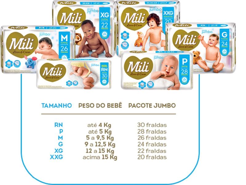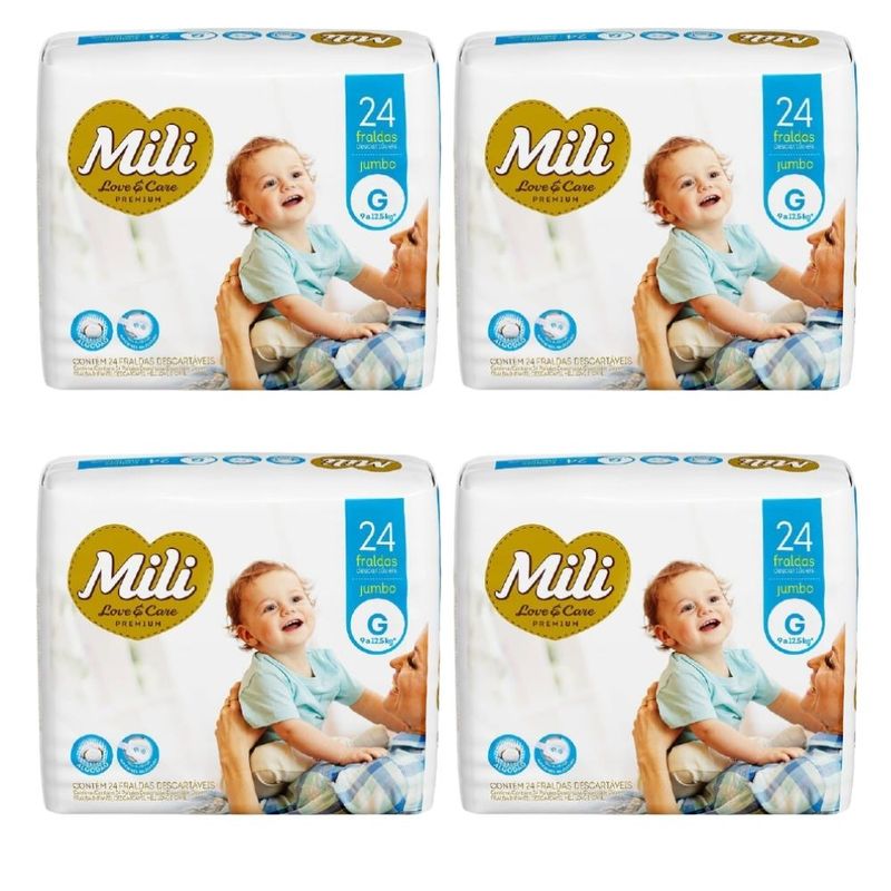 Fralda Descartavel Mili - Love & Care -Linha Premiun - Tamanho G Quantidade: 4 Pacotes contendo 24 fraldas (Total = 96 fraldas) Tamanho G - (para bebês de 9 a 12,5 kg) Marca: Mili Indicado para uso noturno para proteger a noite toda. A Mili Love & Care é uma fralda que foi lançada para surpreender você. Fralda de altíssima qualidade que vai atender as expectativas de quem procura o melhor para o seu bebê: qualidade, conforto e praticidade Depois que você experimentar, não vai querer outra! Com Gel Super absorvente a pele do nenê fica mais seca por mais tempo, distribuindo o xixi de maneira uniforme, evitando que a fralda fique pendurada. Durante a noite a pele fica protegida devido a camada de gel ultra absorvente. A pele respira mais, a fralda se ajusta bem e o bebê se sente melhor. Com até 12 horas de proteção, ela oferece todo o cuidado e suavidade que seu filho precisa para ficar sempre sequinho e confortável. Toque macio Gel absorvente Abas elásticas TABELA TAMANHO X PESO DO BEBÊ RN... até 4 kg P ... até 5 kg M... 5 a 9,5 kg G... 9 a 12,5 Kg XG... 12 a 15 Kg XXG... acima de 15 kg