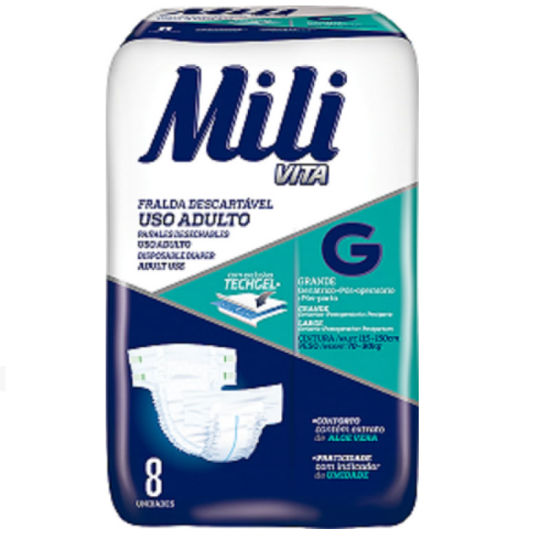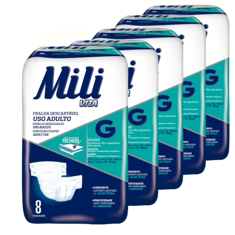 5 Pacotes contendo 8 fraldas (total: 40 fraldas)Marca: MiliTamanho: GIndicado para: cintura: de 115 a 150 cmpeso: 70 a 90 KgAnatômicas e com alto poder de absorção, dão mais conforto e segurançaPara uso: Geriátrico, Pós Operatório, Incontinência, Pós - parto.Fitas adesivas reposicionáveis - Permite abrir e fechar conforme necessário para ajustar ao corpoGel super absorvente e bem distribuído pela fralda, promovendo maior absorção e retenção de umidadeMais conforto: contém extrato de Aloe VeraMais praticidade: com indicador de Umidade