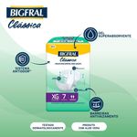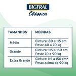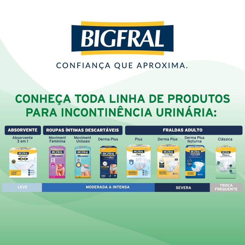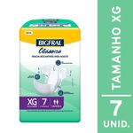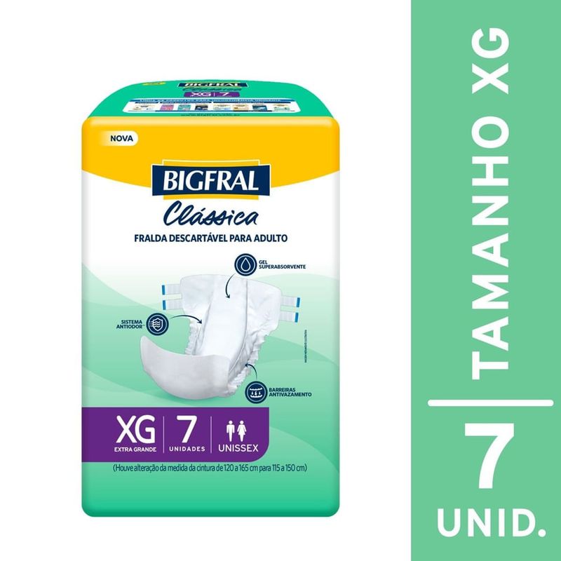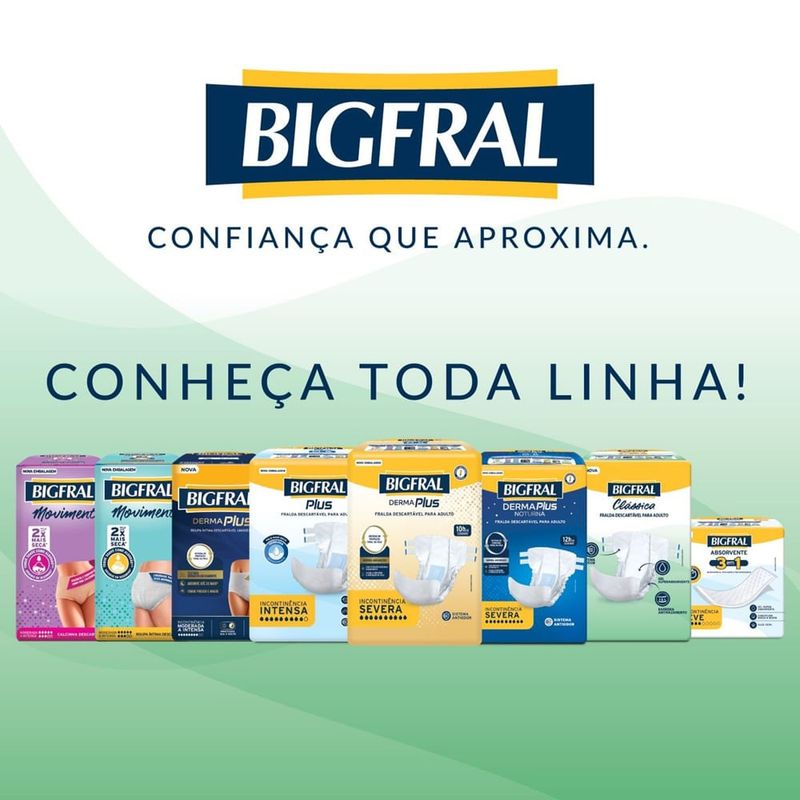 Fralda Geriátrica Bigfral Clássica Tamanho XG 7 Unidades Proteção e cuidado para quem mais precisa! A Fralda Geriátrica Bigfral Clássica Tamanho XG oferece máxima absorção, conforto e segurança para pessoas com incontinência urinária moderada a intensa. Desenvolvida com tecnologia que mantém a pele seca por mais tempo, proporciona liberdade, tranquilidade e bem-estar a adultos e idosos que necessitam de atenção especial no dia a dia. A Bigfral Clássica XG conta com barreiras antivazamento, camada interna extra seca e formato anatômico, garantindo ajuste ideal ao corpo e conforto prolongado. Os fechos adesivos reposicionáveis facilitam o uso e proporcionam mais praticidade, enquanto o indicador de umidade ajuda a controlar o momento da troca. Indicada para uso diurno e noturno, em pacientes com mobilidade reduzida ou acamados. Benefícios Alta absorção: ideal para incontinência urinária moderada a intensa; Barreiras antivazamento: previnem escapes indesejados; Camada extra seca: pele protegida e sensação de frescor por mais tempo; Fechos adesivos reposicionáveis: permitem ajuste prático e seguro; Indicador de umidade: facilita a rotina de cuidados; Formato anatômico: maior conforto para o usuário. Modo de Uso Posicione a fralda entre as pernas da pessoa com o lado absorvente voltado para cima. Ajuste as abas laterais ao redor da cintura e fixe os fechos adesivos. Troque sempre que necessário ou quando o indicador de umidade sinalizar saturação. Precauções e Advertências Uso único. Descartar após o uso em local adequado. Manter fora do alcance de crianças. Em caso de irritação, suspenda o uso e procure orientação médica. Armazenar em local seco, fresco e ao abrigo da luz.