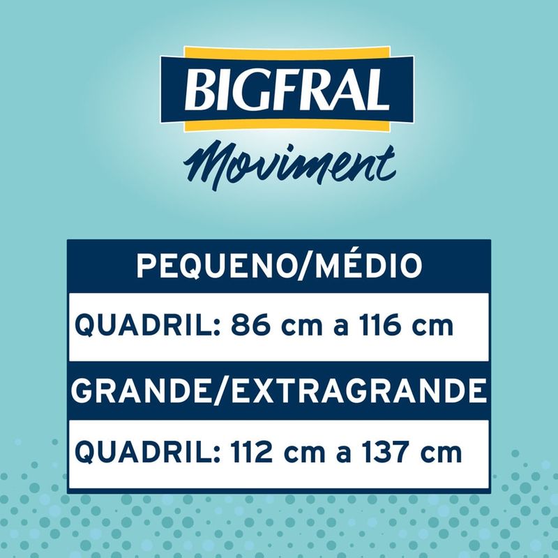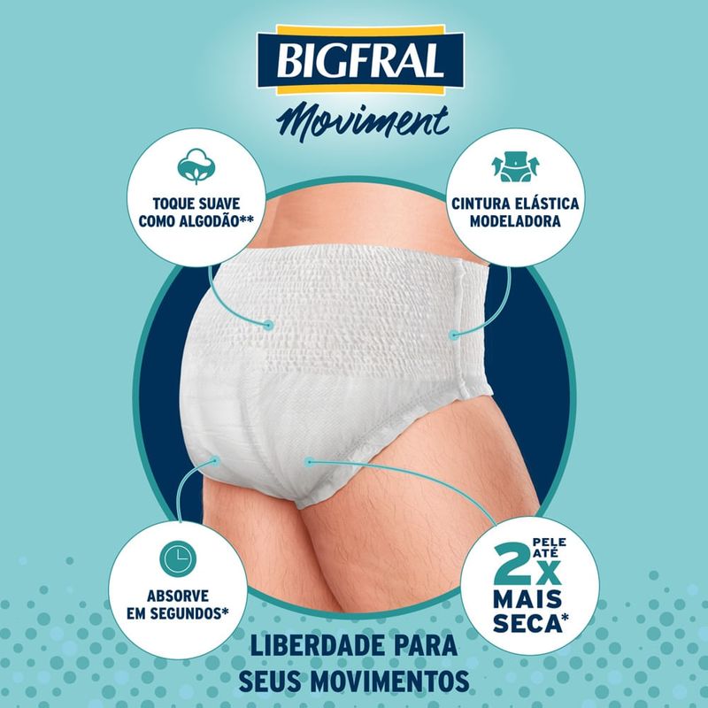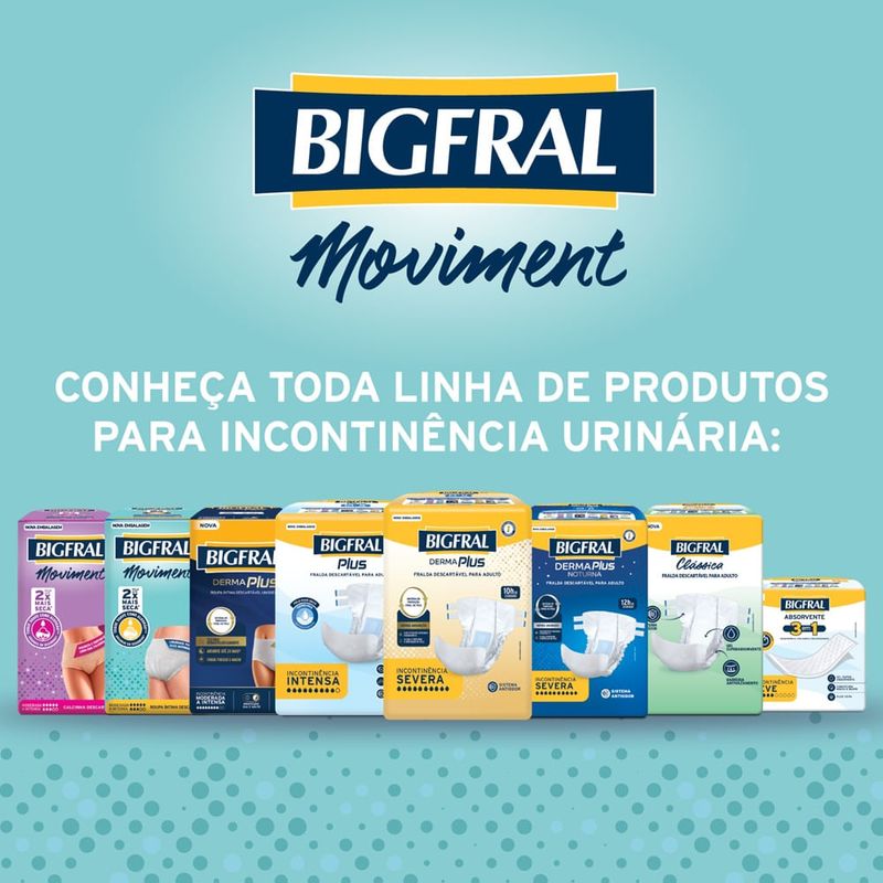 Roupa Íntima Bigfral Moviment Incontinência Moderada a Intensa G/XG 16 Unidades Segurança, liberdade e confiança para todos os momentos! A Roupa Íntima Bigfral Moviment G/XG é desenvolvida para pessoas que convivem com a incontinência urinária moderada a intensa, oferecendo até 12 horas de proteção. Seu formato anatômico veste como uma roupa íntima comum, proporcionando discrição, conforto e liberdade de movimentos durante o dia e a noite. A Bigfral Moviment conta com absorção rápida e sistema que mantém a pele seca, ajudando a reduzir o risco de irritações. Possui ainda sistema antiodor, que neutraliza odores indesejados, garantindo bem-estar e segurança. O tamanho G/XG é unissex e ideal para quem busca um ajuste confortável e prático em qualquer situação. Benefícios Proteção eficaz contra incontinência urinária moderada a intensa; Sistema antiodor que proporciona discrição e confiança; Formato anatômico que veste como roupa íntima convencional; Conforto e liberdade para atividades do dia a dia; Unissex, adequado para homens e mulheres; Praticidade com 16 unidades na embalagem. Modo de Uso Utilize como uma peça íntima comum. Para descartar, basta rasgar as laterais e jogar em uma lixeira adequada. Não reutilizar. Precauções e Advertências Troque sempre que necessário para garantir higiene e conforto; Produto descartável e de uso individual; Armazene em local fresco, seco e protegido do sol; Manter fora do alcance de crianças.