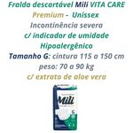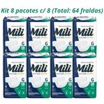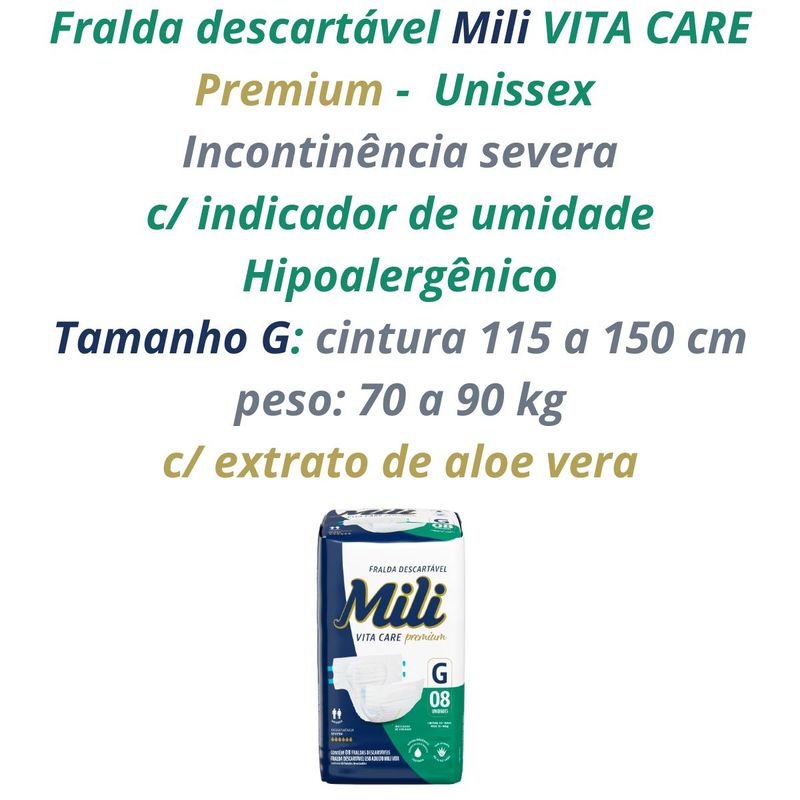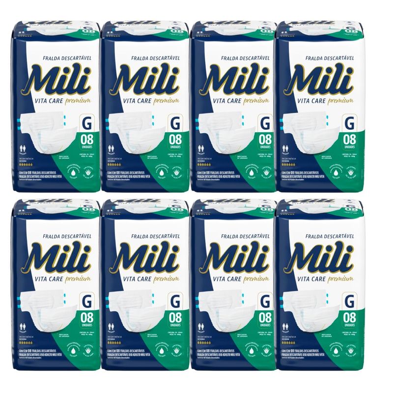 Fralda Geriátrica Mili – Tamanho G (8 Pacotes com 8 Unidades – Total: 64 Fraldas) Alta absorção Conforto anatômico Ideal para adultos Informações do Produto: Marca: Mili Tamanho: G Conteúdo: 8 pacotes com 8 fraldas cada (Total: 64 fraldas) Indicação de uso: Cintura: 115 a 150 cm Peso: 70 a 90 kg Uso recomendado para: Geriátrico Incontinência severa Pós-operatório Pós-parto Fraldas anatômicas: mais conforto e melhor ajuste ao corpo Gel superabsorvente: absorção rápida e eficaz, retendo a umidade com segurança Fitas adesivas reposicionáveis: ajuste perfeito com possibilidade de abrir e fechar quantas vezes precisar Indicador de umidade: praticidade para saber a hora certa da troca Contém extrato de Aloe Vera: cuidado extra com a pele, evitando irritações Ideal para quem busca conforto, segurança e qualidade no cuidado diário! Envio rápido e bem embalado! Aproveite para garantir já o seu kit completo!