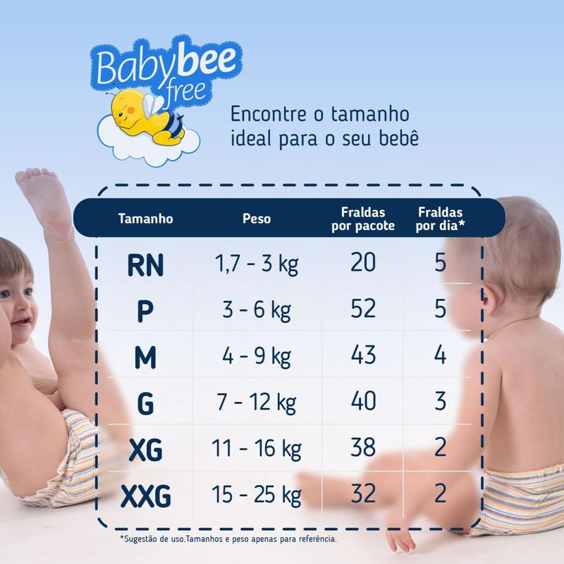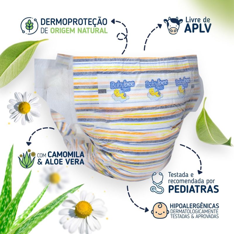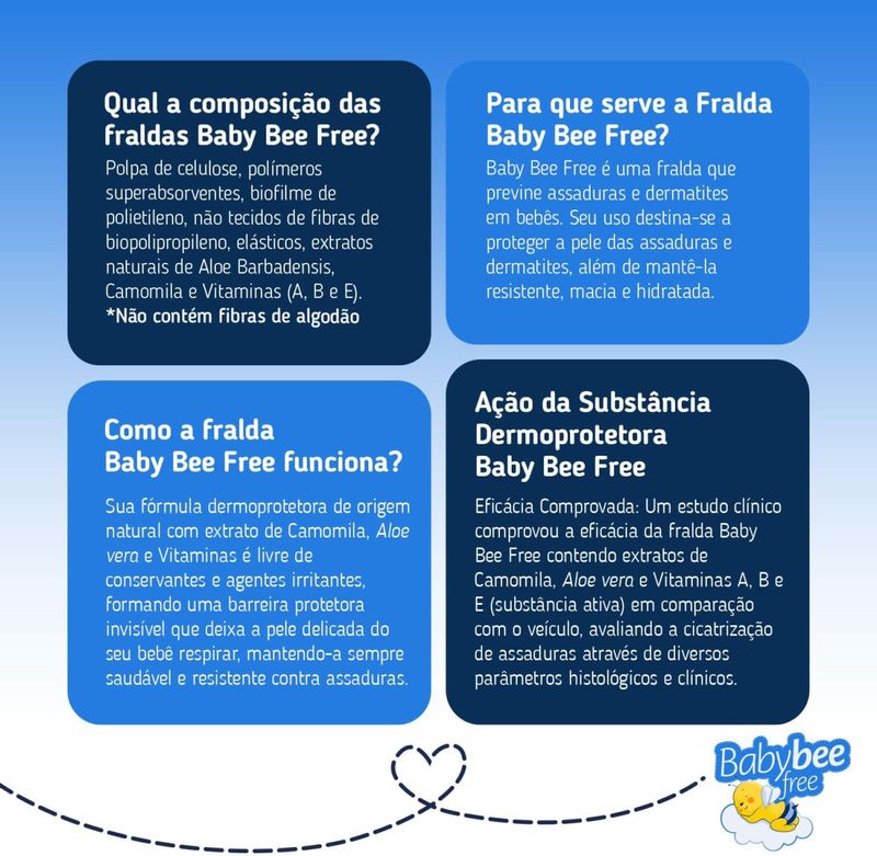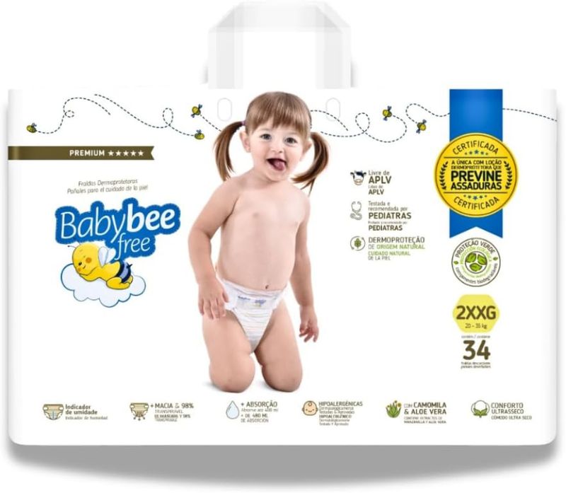 A Fralda Dermoprotetora Baby Bee Free é dermatologicamente testada e ideal para evitar assaduras.Contém componentes naturais hipoalergênicos que deixam seu uso extremamente confortável para os bebês, entre eles: - Camomila: tem propriedades calmantes, fungicidas, refrescantes e cicatrizantes;- Aloe Vera: planta conhecida por suas diversas propriedades medicinais e cosméticas, na pele age como um hidratante, suavizante e cicatrizante. Seu tecido, além de macio, é também transpirável e absorve até 480ml de líquido.Possui também elástico nas costas, orelhas flexíveis e barreira lateral dupla, que forma uma proteção extra contra vazamentos.Para melhorar, sua cintura é larga, o que não aperta a barriguinha, diminuindo possíveis cólicas.