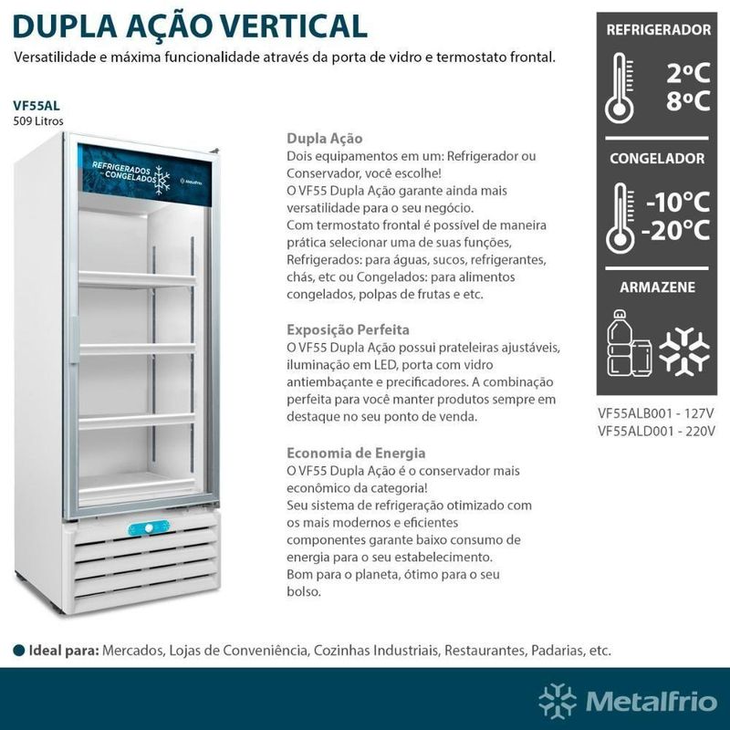 Freezer Conservador Vertical 220v Dupla Ação Porta De Vidro 490 Litros Vf55al - Metalfrio 220vFreezer Conservador Vertical 220v Dupla Ação Porta de Vidro 490 Litros VF55AL - MetalfrioDescrição e Caracteristica da Ficha Técnica:- Degelo: Quando a camada de gelo atingir aproximadamente 1cm de espessura em algum lugar da parte interna do refrigerador, ele deve ser descongelado.Desligue o refrigerador(posição OFF da chave seleção) - NUNCA utilize objetos metálicos e cortantes para raspar o gelo.- DESEMPENHO PROFISSIONAL: Com compressor de alta eficiência e condensador helicoidal, congela alimentos de forma rápida e eficiente, mesmo em condições climáticas extremas.- DUPLA AÇÃO: Por meio de uma chave seletora, você escolhe entre DUAS funções: refrigerador de bebidas ou freezer para congelados.- CONSERVAÇÃO DE ALIMENTOS: Oferece uma faixa de temperatura específica para armazenar alimentos, seguindo os requisitos da Anvisa.- CONDENSADOR HELICOIDAL: Dispensa a limpeza frequente e proporciona maior vida útil ao motor e ao compressor.- ECONOMIA: É o equipamento de mais baixo consumo de energia da categoria.- GÁS ECOLÓGICO: Gás refrigerante ecológico R290 reduz em até 99% as emissões de gases causadores de efeito estufa.- Voltagem: 220V- Frequência: 50Hz / 60Hz- Prateleira : 3 pç REGULÁVEIS ALTURA- Faixa Temp.:Função Refrigerador: +2°C / +8°CConsumo médio:48 Kwh/mêsFunção: CONGELADOS: -10°C / -20°CConsumo médido: 107 Kwh/ mês- Capacidade Bruta: 509 litros- Capacidade Líquida: 490 litros- Peso Líquido: 95 kg- Peso Bruto - 105kgMedidas Interna: 138cm A x 55,5cm L x 67cm PMedidas Externas: 186cm A x 67,5cm L x 80cm PMedidas Embalado: 197cm A x 72cm L x 92cm PNA Voltagem: 220V