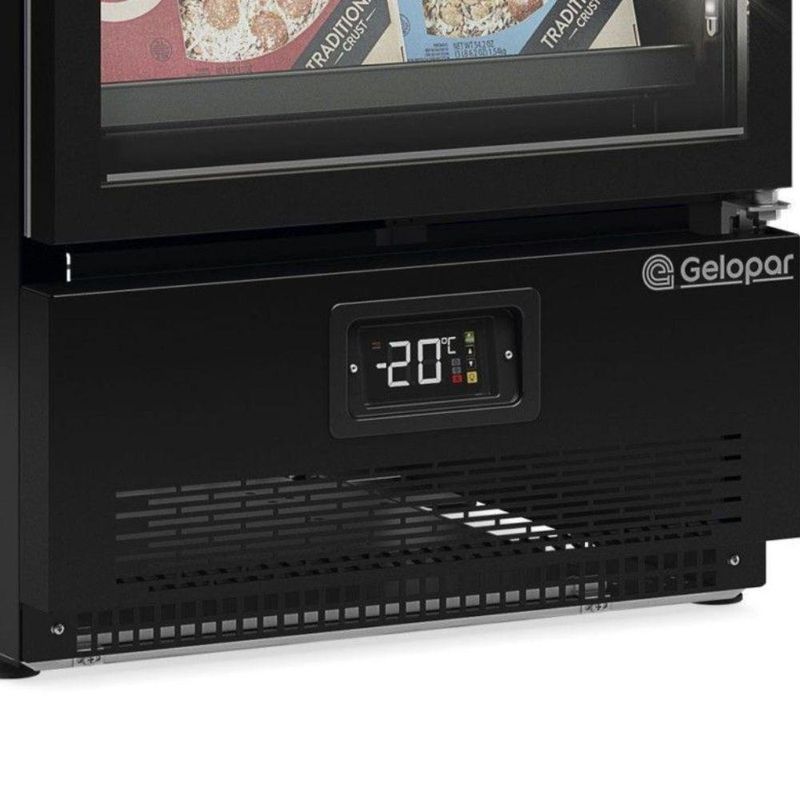 Freezer Expositor Vertical 1 Porta Gcvc45cb Gelopar Expositor Preto 220vConservador Vertical Linha Conveniência Carbono 445L GCVC45CB Gelopar. Conservação e exposição de produtos congelados. Temperatura: -12°C a -20°C. Refrigeração: Ar forçado com evaporador aletado. Controlador eletrônico com indicador de temperatura. Degelo: Automático. Iluminação: LED (interna) perimetral vertical, com interruptor. Porta: Vidro duplo temperado baixo emissivo, com serigrafia, perfil slim e sistema de aquecimento. Fechamento automático. Carenagem inferior em aço pré-pintado preto. Prateleiras aramadas: 4 níveis reguláveis e inclináveis. Revestimento: Interno e externo em aço pré-pintado preto. Pés niveladores. Perfil porta etiquetas. CAPACIDADE: 445L. CONSUMO: 14,54kWh/dia. PESO: 98kg. DIMENSÕES EXTERNAS(CxAxL): 64,5x196,2x64cm. Equipamento certificado conforme Portaria Inmetro nº 371/2009. Conservador Vertical Linha Conveniência Carbono 445L GCVC45CB Gelopar é na Atau.Marca - GeloparModelo - GCVC45CBCapacidade - 445LFrente - 64,5cmAltura - 196,2cmProfundidade - 64cmTemperatura - -12°C a -20°CPeso - 98kgConsumo - 14,54kWh/dia