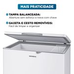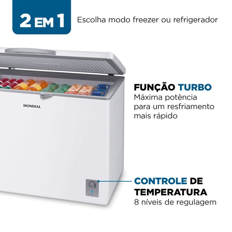 O Freezer Horizontal Mondial 308 Litros é uma excelente solução para quem busca praticidade, eficiência e organização ao armazenar alimentos e bebidas. Com congelamento rápido, oferece maior conservação dos produtos. Seu amplo espaço se adapta perfeitamente às cozinhas, áreas de serviço ou ambientes comerciais.Com incrível funcionalidade 2 em 1, pode ser usado como freezer ou refrigerador para total flexibilidade no dia a dia. Sua tampa balanceada permite abertura sem esforço, enquanto o puxador com chave oferece segurança extra, proporcionando maior controle no uso.Com 8 níveis de controle de temperatura, você pode ajustar a conservação dos seus itens com precisão. Já a função Turbo acelera o processo, atingindo a temperatura ideal muito mais rápido.Além de facilitar a organização e a limpeza com a gaxeta e o cesto aramado removíveis, o Freezer da Mondial também conta com um dreno frontal que elimina a água com facilidade, tornando o uso ainda mais prático. Para mais mobilidade, os rodízios giratórios permitem mover o aparelho sem esforço.Sustentável e ecológico, o Freezer Mondial utiliza o Gás R600A, que não prejudica a camada de ozônio e contribui para a preservação do meio ambiente. Descubra todas as funcionalidades do FHZ-01-W320:Capacidade de 308 Litros: Amplo espaço para armazenar alimentos e bebidas com eficiência, proporcionando congelamento rápido e maior durabilidade.2 em 1: Escolha entre os modos freezer ou refrigerador de acordo com a sua necessidade e tenha mais versatilidade para conservar alimentos frescos ou manter congelados, tudo em um único equipamento.8 Níveis de Controle de Temperatura: Permite ajustar facilmente a temperatura ideal, nas funções freezer ou refrigerador, preservando o frescor e a qualidade dos alimentos e bebidas.Função Turbo: Máxima potência e desempenho para congelar seus alimentos em menos tempo.Praticidade e Segurança: A tampa balanceada facilita o manuseio, permitindo abertura sem esforço. O puxador ergonômico com chave, oferece mais controle e segurança, evitando acessos indesejados.Mais facilidade para você: A gaxeta e o cesto aramado são removíveis e otimizam a limpeza e organização. Além disso, o dreno frontal agiliza o escoamento da água, tornando tudo mais prático.Rodízios Giratórios: Permitem a movimentação de forma eficiente durante a limpeza ou para realizar mudanças de lugar.Sustentabilidade e Eficiência Energética: O freezer utiliza o gás ecológico R600A, que contribui para a preservação do meio ambiente e não agride a camada de ozônio.Garantia Prolongada - 10 Anos no Compressor: O compressor do FHZ-01-W320 conta com 10 anos de garantia* a partir da data de emissão da nota fiscal, oferecendo tranquilidade e segurança.*Para outros componentes, o prazo de garantia é de 12 meses.Um Ano de Garantia Mondial: A Mondial é a escolha de milhões de consumidores. Mondial, a escolha inteligente!
