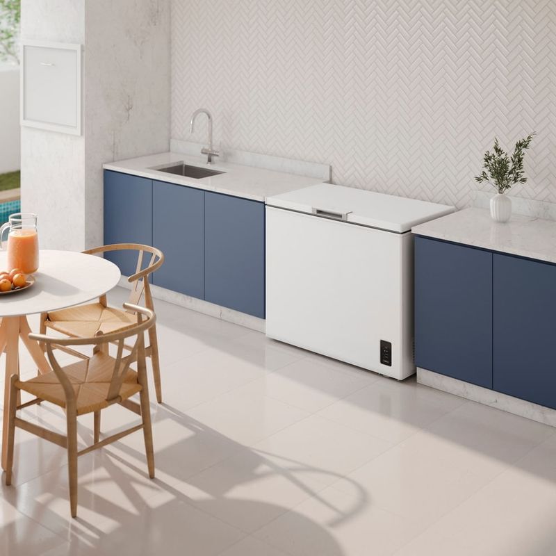 O Freezer Horizontal Electrolux 245L Inverter Bivolt Uma Porta Branco (HB250) vai transformar o seu dia a dia: equipado com Tecnologia Inverter¹, ele mantém a temperatura interna mais estável, criando as condições ideais para preservar seus alimentos frescos por muito mais tempo, além de proporcionar uma economia de até 37%² no consumo de energia. Com a exclusiva tecnologia SmartBivolt, você pode conectar seu freezer tanto em 127V quanto em 220V, garantindo máxima flexibilidade e resistência a oscilações de tensão2.A Função 3 em 1 permite refrigerar, conservar e congelar, oferecendo até 7 níveis de temperatura para você escolher o que melhor preserva o frescor de cada ingrediente. Conte também com o Turbo Freezer, que proporciona resfriamento rápido de alimentos e bebidas — perfeito para festas, para quando chega com as compras ou precisa congelar algo rapidamente.O Controle de Temperatura externo permite ajustar as configurações sem precisar abrir a porta e, para sua segurança, conta ainda com a função de bloqueio que evita alterações indesejadas. A iluminação LED garante excelente visibilidade do interior do freezer, além de ser econômica.Para facilitar ainda mais o seu dia a dia, o freezer possui rodas que tornam o transporte e o posicionamento muito mais práticos. E para completar, o Gás Ecológico R600 é utilizado no sistema de refrigeração, protegendo o meio ambiente e a camada de ozônio.É recomendado o uso de acessórios originais Electrolux.¹Em relação ao mínimo para a classificação C.²A oscilação de tensão pode afetar a performance de refrigeração, as condições de preservação dos alimentos e a eficiência energética da geladeira. Independentemente da voltagem da rede elétrica, respeite as normas de segurança e as instruções do manual do produto.