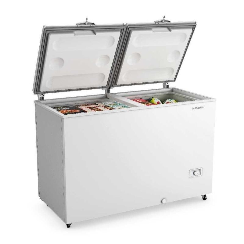 Freezer Horizontal Inverter Dupla Ação 417 Litros Tampa Cega Da420if Tech Bivolt - MetalfrioDESCRIÇÃO DO PRODUTO:O DA420IF da Linha Chest Freezer Tech possui a tecnologia Inverter.Um sistemta inteligente que se adapta perfeitamente ao uso, funciona em ambas as voltagens, é silencioso e consome menos energia - classificação energética A.- Ideal para Cozinhas industriais, restaurantes, bares, buffets, lojas de conveniência sítios, áreas de lazer e salão de festas;- Dupla Ação: Dois equipamentos em um;- Fácil ajuste da função do freezer ou refrigerados na frente do produto;- Bivolt: Funciona em ambas as voltagens e responde melhor aos picos e instabilidades de rede elétrica;- Inverter: Desempenho otimizado de acordo com a carga. Além disso é silencioso e possui alto nível de eficiência energética, reduzindo o consumo de energia do seu estabelecimento;- Alta capacidade: Espaço suficiente para manter o estoque em dia, com toda tranquilidade. Separador interno removível facilita a organização dos produtos;- Até 10% de economia de energia em comparação aos compressores convencionais: Enquanto o compressor comum trabalha em ciclos de liga e desliga exigindo um pulso maior de energia, o inverter realiza a sua função de forma contínua, ajustando a velocidade de acordo com a demanda;- Dreno frontal: Dispensa o deslocamento do equipamento para degelo;- Gabinete interno em aço pré-pintado: Com pintura em esmalte epóxi, auxilia na limpeza interna, evitando manchas, riscos e corrosões;- Gaxeta removível: Facilita a limpeza do equipamento e a remoção das sujeiras mais difíceis;- Melhor desempenho: Desempenho em seu congelamento, ideal para as rotinas agitadas de restaurantes e cozinhas industriais;- Puxador ergonômico: Design ergonômico facilita a abertura e o fechamento da tampa, permitindo o encaixe perfeito da mão;- Rodízios giratórios: Facilitam movimentação para mudança de layout ou limpeza.- Tampa balanceada: Leve para abrir, resistente e segura para vedar.ESPECIFICAÇÕES:- Modelo: DA420IF Tech;- Medidas do produto (LxAxP): 1333x945x728 mm;- Medidas internas (LxAxP): 1223x732x515 mm;- Capacidade Bruta: 417 litros;- Capacidade Líquida: 417 litros;- Quantidade de portas: 02;- Faixa de Temperatura: Freezer -18 a -22°C / Refrigerador +2 a +8°C;- Classificação do Produto: Refrigerador e freezer;- Cor: Branco;- Peso Líquido: 60 kg;- Voltagem: Bivolt. Modelo: DA420 | Voltagem: Bivolt
