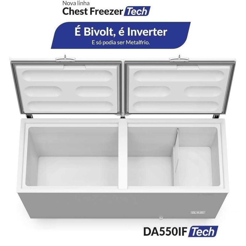 Freezer Horizontal Inverter Dupla Ação 543 Litros Tampa Cega Da550if Tech Bivolt - MetalfrioDESCRIÇÃO DO PRODUTO:O DA550IF da Linha Chest Freezer Tech possui a tecnologia Inverter, um sistema inteligente que se adapta perfeitamente ao uso, funciona em ambas as voltagens, é silencioso e consome menos energia - classificação energética A.- Ideal para Cozinhas industriais, restaurantes, bares, buffets, lojas de conveniência sítios, áreas de lazer e salão de festas;- Dupla Ação: Dois equipamentos em um;- Fácil ajuste da função do freezer ou refrigerados na frente do produto;- Bivolt: Funciona em ambas as voltagens e responde melhor aos picos e instabilidades de rede elétrica;- Inverter: Desempenho otimizado de acordo com a carga. Além disso é silencioso e possui alto nível de eficiência energética, reduzindo o consumo de energia do seu estabelecimento;- Alta capacidade: Espaço suficiente para manter o estoque em dia, com toda tranquilidade. Separador interno removível facilita a organização dos produtos;- Até 10% de economia de energia em comparação aos compressores convencionais: Enquanto o compressor comum trabalha em ciclos de liga e desliga exigindo um pulso maior de energia, o inverter realiza a sua função de forma contínua, ajustando a velocidade de acordo com a demanda;- Dreno frontal: Dispensa o deslocamento do equipamento para degelo;- Gabinete interno em aço pré-pintado: Com pintura em esmalte epóxi, auxilia na limpeza interna, evitando manchas, riscos e corrosões;- Gaxeta removível: Facilita a limpeza do equipamento e a remoção das sujeiras mais difíceis;- Melhor desempenho: Desempenho profissional em seu congelamento, ideal para as rotinas agitadas de restaurantes e cozinhas industriais;- Puxador ergonômico: Design ergonômico facilita a abertura e o fechamento da tampa, permitindo o encaixe perfeito da mão;- Rodízios giratórios: Facilitam movimentação para mudança de layout ou limpeza.- Tampa balanceada: Leve para abrir, resistente e segura para vedar.ESPECIFICAÇÕES:- Modelo: DA550IF Tech;- Medidas do produto (LxAxP): 1668x945x728mm;- Medidas internas (LxAxP): 1558x732x515 mm;- Capacidade Bruta: 543 litros;- Capacidade Líquida: 543 litros;- Quantidade de portas: 02;- Faixa de Temperatura: Freezer -18 a -22°C / Refrigerador +2 a +8°C;- Classificação do Produto: Refrigerador e freezer;- Cor: Branco;- Peso Líquido: 69 kg;- Voltagem: Bivolt. Voltagem: Bivolt | Modelo: DA550IF Tech | Cor: Branco