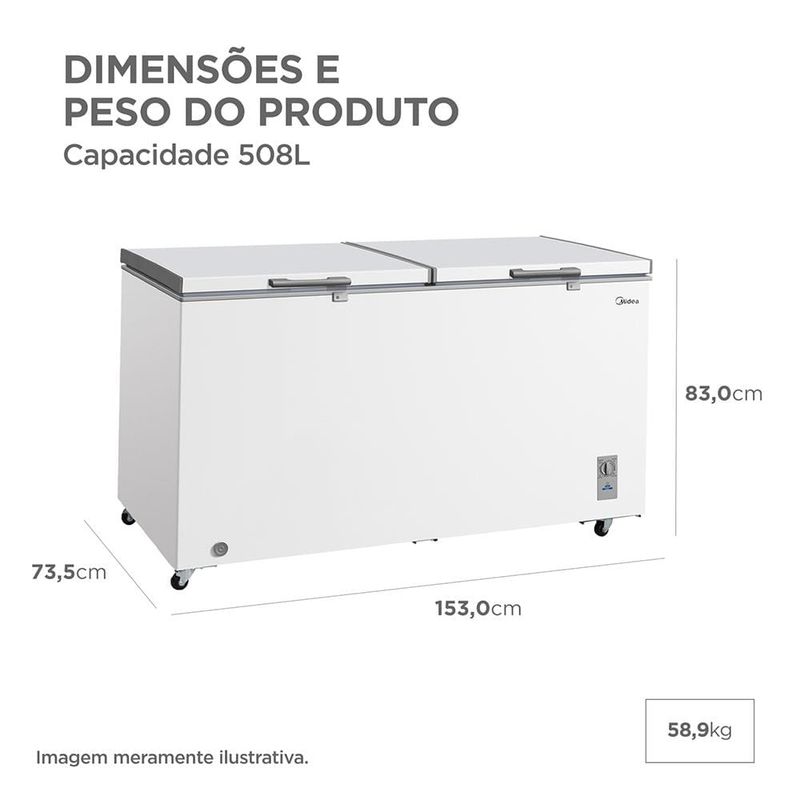 Freezer Horizontal Midea 508L Inverter Bivolt + Turbo Freezer + 3 em 1 + Novo A + 2 Cestos O Freezer Horizontal Midea 508L Inverter é a solução definitiva para demandas de grande volume, seja para uso residencial amplo ou comercial. Equipado com a avançada tecnologia Inverter, ele entrega um resfriamento rápido e extremamente estável, garantindo a preservação dos alimentos por mais tempo com baixíssimo ruído e eficiência energética Novo A.Sua versatilidade 3 em 1 permite que o equipamento atue como Freezer, Conservador ou Refrigerador, com uma ampla faixa térmica de $10°C$ a $-28°C$. Além disso, o sistema Flexi Volt permite o uso em 127V ou 220V com total segurança. O design robusto conta com duas portas, puxadores externos ergonômicos e fechadura de segurança para proteção total do seu estoque.Pensado para a praticidade no manejo de grandes cargas, possui quatro rodízios que facilitam o deslocamento, dreno frontal para limpeza e dois cestos de armazenagem para melhor organização. Com o uso do gás ecológico R600a e a confiança de 10 anos de garantia no compressor, este freezer une sustentabilidade e durabilidade inigualáveis.Capacidade Gigante de 508L: Ideal para quem não pode ficar sem espaço.Tecnologia Inverter: Reduz drasticamente o consumo de energia em relação a modelos convencionais.Função Turbo Freezer: Resfriamento acelerado para grandes quantidades de alimentos.Mobilidade Facilitada: Possui 4 rodas para fácil movimentação, mesmo carregado.Garantia de 10 Anos: Proteção estendida direto no compressor Inverter. Que tal aproveitar e completar sua cozinha com um belo fogão para lhe ajudar em todos os momentos? Aproveite!
