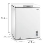 Armazene e congele alimentos no mesmo equipamento com 145L de capacidadeO Freezer Horizontal Midea 145L é ideal para quem precisa preservar alimentos de forma prática e eficiente. Compacto, adapta-se facilmente a ambientes menores, oferecendo versatilidade no dia a dia.Graças às suas funções ajustáveis, pode ser utilizado como freezer, com temperaturas entre -24°C e -12°C, ou como refrigerador, variando de 0°C a 10°C. O cesto removível facilita a organização interna, enquanto o dreno frontal torna o degelo mais simples.Com baixo consumo de energia e classificação A, garante economia e desempenho sem abrir mão da qualidade.Praticidade e eficiência para armazenar alimentos de acordo com a sua necessidade.Especificações técnicasMarca: MideaModelo: Freezer Midea 145LVoltagem: 127VCor: BrancoCor interna: Prata Tipo: Freezer HorizontalUso Recomendado: Residencial / ComercialCapacidade Total: 145 litrosTemperatura de Freezer mínima: -24°C e máxima -12°CTemperatura de refrigerador mínima: 0°C e máxima 10°CDegelo: ManualConsumo de Energia: 27,8 kWh/mês Classificação energética: AFluido Refrigerante: R600aControle de Temperatura: Termostato mecânicoDisplay: Não possuiIluminação Interna: Não possuiCesto de armazenagem: Sim, 1Espátula de gelo: Sim, 1.Puxador: SimDreno: FrontalLuz Indicadora de Funcionamento: Sim Pés: 2 rodízios somente na base do compressorAlarme de Porta Aberta: NãoTrava de Segurança: NãoFunções: Resfriar, Conservar e FreezerMaterial Externo: Aço galvanizadoMaterial Interno: AlumínioDimensões do produto embalado: 66,5 L x 88,8 A x 57,8 P cmPeso bruto: 28kgDimensões do produto: 62,8 L x 85 A x 56,2 P cmPeso: 24,8kgGarantia: 12 meses