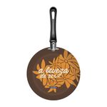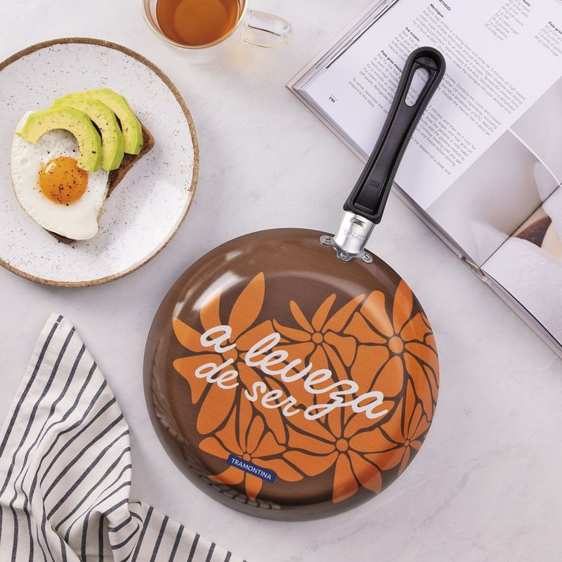 Frigideira 24 cm 1,2L Tramontina Alumínio Antiaderente Starflon Max e Externo Siliconado Estampado Tramontina - Frigideira 24 cm 1,2L Tramontina AlumÃnio Antiaderente Starflon Max e Externo Siliconado Estampado Versatilidade e eficiência para o preparo das suas refeições. A frigideira Tramontina em alumÃnio com revestimento interno em antiaderente Starflon Max e externo siliconado estampado 24 centÃmetros de diâmetro e capacidade de 1,2 litro, é ideal para o dia a dia. O antiaderente evita que os alimentos grudem, garantindo mais facilidade na hora de cozinhar e limpar. Seu cabo em baquelite antitérmico proporciona manuseio seguro. Um item funcional que alia bom desempenho e praticidade em cada uso. Corpo de alumÃnio com espessura de 2 mm que proporciona cozimento rápido e uniforme. Revestimento interno de antiaderente Starflon Max que não gruda, é fácil de limpar, mais durável e não é prejudicial à saúde, pois é livre de PFOA. Revestimento externo siliconado.Cabo de baquelite antitérmico que oferece segurança durante o manuseio.Pode ser utilizada nos fogões: gás e elétrico. Cuidados com o produto A capacidade volumétrica máxima para cozimento é de 3/4 da capacidade total da peça. Posicione o cabo do utensÃlio voltado ao centro do fogão. Em fogões com grade, centralize a peça sobre a chama ou fonte de calor e alinhe o cabo com a grade. UtensÃlios quentes devem estar fora do alcance das crianças. Antes do primeiro uso, lave com esponja macia, sabão neutro ou detergente lÃquido. Depois de secar, unte a área interna com óleo ou gordura e leve ao fogo por um ou dois minutos. Deixe esfriar e lave novamente. Seu utensÃlio Starflon está pronto para uso com ou sem gordura, sempre em fogo baixo ou médio (nunca superior a 220 ºC). Ao manusear seu utensÃlio aquecido, cuide para não arranhar/riscar o revestimento externo. Evite manchas não deixando escorrer gordura e alimentos na área externa da peça. Caso esta situação ocorra, é recomendado realizar a limpeza imediata do local com um pano umedecido em água. Para mexer os alimentos use somente utensÃlios de silicone, nylon ou madeira. Este produto não necessita de manutenção, apenas limpeza.Limpeza: Evite a imersão do utensÃlio quente em água fria. Nunca utilize produtos abrasivos na lavagem. Se deixar queimar alimentos, umedeça a área e reserve até que possa remover os resÃduos grudados com esponja e sabão. Para maior durabilidade, não utilize em máquinas de lavar. Para descarte dos produtos e embalagem siga as orientações de reciclagem vigentes. Garantia 90 dias para vÃcios ou defeitos de fabricação. - - Características Gerais do Produto: Garantia: • 3 Meses