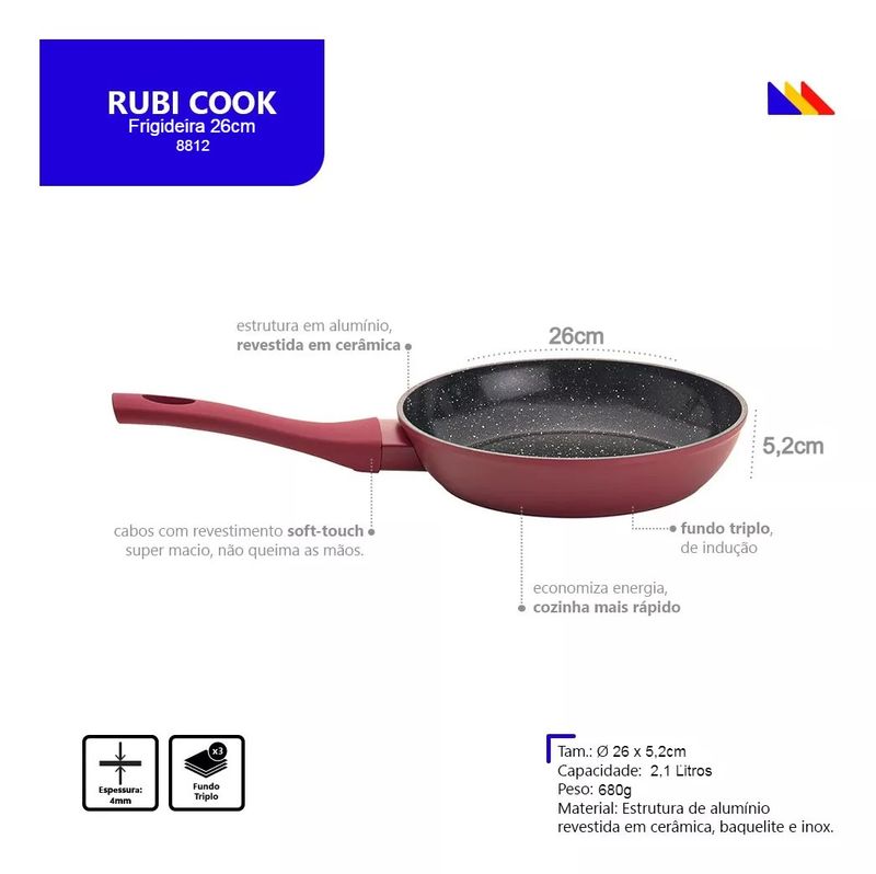 Frigideira Cerâmica Antiaderente Indução 26cm Rubi Cook | Mimo Style A frigideira da linha Rubi Cook da Mimo Style é o item ideal para compor sua cozinha com seu design diferenciado, moderno e sofisticado. A panela possui 3 camadas, sendo duas de revestimento cerâmico e uma camada resistente a altas temperaturas. Com estrutura de alumínio as panelas possuem 4mm de espessura que proporciona uma maior durabilidade do produto, como também mais uniformidade térmica, cozinhando os alimentos de maneira uniforme, sem variações de temperatura. Sem contar que elas também mantêm o calor por mais tempo mesmo fora do fogo, possibilitando refeições aquecidas até mesmo à mesa. Com revestimento soft-touch, toque super macio, em seus cabos e alças, confortável ao segurar e previne queimaduras. Possui fundo triplo que pode ser utilizado nos fogões a gás (em fogo baixo!), elétrico, vitrocerâmico e no cooktop de indução. O sistema de indução funciona através de ondas eletromagnéticas, estimuladas pelas propriedades magnéticas presentes no fundo da panela. Assim, o fogão de indução só aquece quando as duas superfícies entram em contato. Graças a condutibilidade de calor rápida e eficiente do alumínio, cozinhar em temperatura baixa ou média é suficiente, reduz o consumo de gás e energia elétrica. O revestimento cerâmico não deixa o alimento grudar, permitindo o uso de menos óleo, facilitando a limpeza. É livre de metais pesados, e elementos prejudiciais à saúde (PFOA free), por isso possui classificação A (ótima) no inmetro. - DESIGN: A frigideira foi projetada em alumínio com revestimento cerâmico, possui um fundo triplo para fogão de indução. Com sua característica antiaderente, diminui a necessidade de usar azeite e óleo. O cabo possui revestimento com tecnologia soft-touch, toque macio e confortável ao segurar, prevenindo acidentes e queimaduras. - ADEQUADAS PARA TODOS OS FOGÕES: A frigideira pode ser utilizada em todos os tipos de fogões elétricos, vitrocerâmicos, gás e indução. O material conduz o calor de forma uniforme, reduzindo o consumo de gás e energia, permitindo que você cozinhe os alimentos em fogo baixo ou médio. - PARA QUALQUER NECESSIDADE: É a aliada perfeita no preparo de suas refeições. Extremamente prática para uso diário, pode ser utilizada no preparo do seu café da manhã ao jantar. Prepare omeletes, ovos mexidos, carnes, vegetais e outros diversos tipos de alimentos com nossa frigideira para completar suas refeições. - COZINHA SAUDÁVEL: A frigideira possui um revestimento antiaderente, reduzindo o uso e consumo de óleo e azeite no preparo de suas refeições. O seu material permite a condução do calor por igual em toda a frigideira reduzindo também o uso de energia elétrica e gás. - FÁCIL HIGIENIZAÇÃO: Os produtos indicados para a limpeza do produto são: detergente suave e/ou neutro e água morna. Aplique com um pano macio ou uma esponja de nylon, enxague e seque. Não utilize abrasivos e palha de aço. Não é recomendável o uso em lava-louças, fornos ou micro-ondas. Especificações Técnicas: Modelo: Frigideira 26cm Rubi Cook Composição: Alumínio e Baquelite Capacidade: 2,1 litros / 680g Indicada para fogões: Elétrico, Indução, Gás e Vitrocerâmico Conteúdo da Embalagem: 01 unidade Dimensões (L x A x C): 26 x 5,2 x 46cm Diâmetro: 26cm Peso: 740g