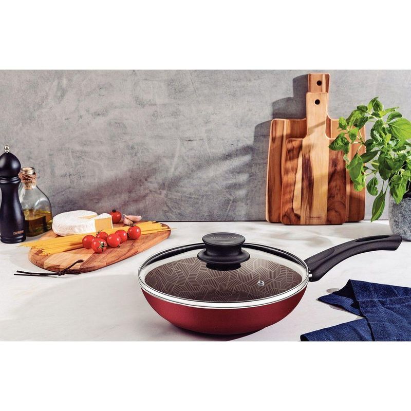 Frigideira Funda Tramontina Paris Antiaderente Starflon Max Vermelho Tampa Vidro 26 Cm 2,9 L TramontinaFrigideira Funda Tramontina Paris Antiaderente Starflon Max Vermelho Tampa Vidro 26 cm 2,9 L Tramontina -Frigideira Funda Tramontina Paris Antiaderente Starflon Max Vermelho Tampa Vidro 26 cm 2,9 LA frigideira funda Tramontina Paris em alumínio com revestimento interno e externo em antiaderente Starflon Max vermelho com tampa de vidro 26 centímetros 2,9 litros vai ser sua melhor ajudante no preparo das suas refeições. Com ela, você pode preparar frituras em imersão de maneira rápida e fácil, pois é produzida em alumínio com espessura de 2 milímetros. Seu revestimento interno e externo é em Starflon Max, característica que evita que os alimentos grudem em sua superfície, a torna fácil de limpar, mais durável e não prejudicial a saúde, pois é livre de PFOA. Para sua segurança, o cabo em baquelite antitérmico não aquece e deixa seu manuseio muito mais seguro e confortável. Além de todos esses atributos incríveis, ela ainda pode ir à máquina de lavar louças e vai facilitar seu dia a dia!Corpo de alumínio com espessura de 2 mm que proporciona cozimento rápido e uniforme. Revestimento interno e externo de antiaderente Starflon Max que não gruda, é fácil de limpar, mais durável e não é prejudicial à saúde, pois é livre de PFOA.Cabo de baquelite antitérmico que oferece segurança durante o manuseio. Pode ir à máquina de lavar louças facilitando seu dia a dia.Pode ser utilizada nos fogões: gás, elétrico e vitrocerâmico - resistência elétrica.Cuidados com o produto A capacidade volumétrica máxima para cozimento é de 3/4 da capacidade total da peça. Posicione o cabo do utensílio voltado ao centro do fogão.Em fogões com grade, centralize a peça sobre a chama ou fonte de calor e alinhe o cabo com a grade. Utensílios quentes devem estar fora do alcance das crianças. Antes do primeiro uso, lave com esponja macia, sabão neutro ou detergente líquido. Depois de secar, unte a área interna com óleo ou gordura e leve ao fogo por um ou dois minutos. Deixe esfriar e lave novamente. Seu utensílio Starflon está pronto para uso com ou sem gordura, sempre em fogo baixo ou médio (nunca superior a 260 ºC). Para mexer os alimentos use somente utensílios de silicone, nylon ou madeira. Com o uso, o cabo pode afrouxar devido à dilatação normal dos materiais. Reaperte apenas o suficiente, sem forçar. Limpeza: Evite a imersão do utensílio quente em água fria. Nunca utilize produtos abrasivos na lavagem. Se deixar queimar alimentos, umedeça a área e reserve até que possa remover os resíduos grudados com esponja e sabão. Para descarte do produto e embalagem siga as orientações de reciclagem vigentes.Garantia90 dias para vícios ou defeitos de fabricação. - Produto com certificação compulsória certificada pelo OCP 0040 - SGS, registro 001793/2018, modelo frigideira funda e classificação de antiaderência A (ótima), conforme portaria INMETRO 499/2021. -Características Gerais do Produto:Garantia: - 3 Meses