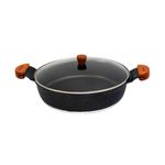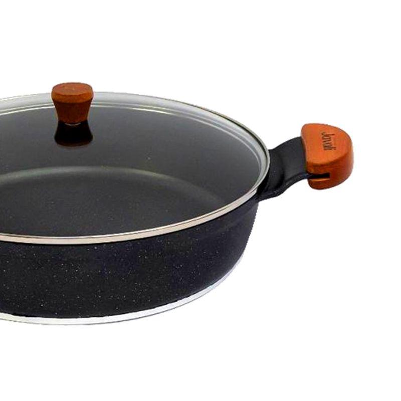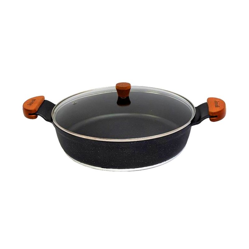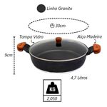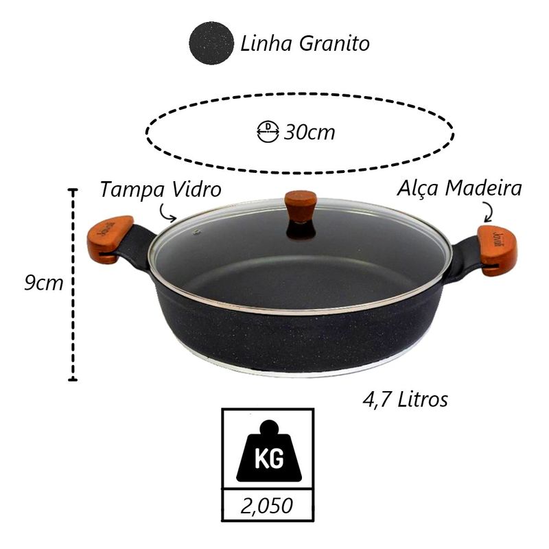 Frigideira Granito Preto Gourmet Antiaderente Javali AM 30cm A frigideira antiaderente, também conhecida como teflon, é revestida com uma substância capaz de repelir certas substâncias. Por isso, a comida não gruda nela. É resistente a altas temperaturas e a arranhões. As frigideiras em alumínio antiaderente contam com uma camada que cobre o seu material e evita que o alimento grude em seu interior. Dessa forma, contribuem para uma culinária saudável, dispensando o uso excessivo de gordura ou óleos vegetais. Para quem gosta de um peixe ou filé de frango grelhado, ou não dispensa uma omelete delicioso, não pode deixar de ter uma em sua cozinha. Manutenção e Dicas:1. Evite grandes mudanças de temperatura. (Levar uma frigideira quente para a água fria pode fazer com que a frigideira deforme.)2. Limpe suas frigideiras antiaderentes com esponjas que não causem riscos.3. Use detergentes mais suaves para limpar suas frigideiras antiaderentes.4. Não use metal na sua frigideira antiaderente.5. Não é ideal para máquina lava louças.6. Evite altas temperaturas de cozimento.7. Não deixe a frigideira vazia no fogo. Especificações Técnicas:Revestimento Externo: Antiaderente Marmorizado Granito.Revestimento Interno: Antiaderente Marmorizado Granito.Alça de Madeira Tampa de Vidro.Litragem: 4,7L.Peso: 2,050Kg.Largura: 30cm.Altura: 9cm. Itens Inclusos:01 Frigideira Granito Preto Gourmet Antiaderente Javali AM 30cm. Código: 2164JAVProdutoLojaPlast.