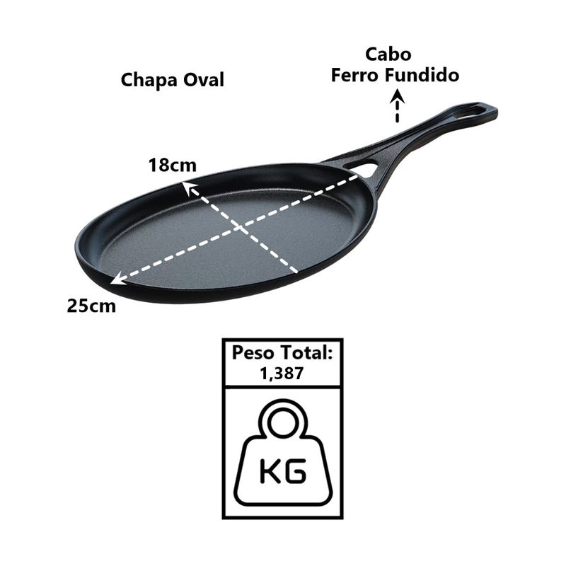 Frigideira Oval Cabo Ferro Fundido Servir Porção 25x18cm Frigideira Oval Cabo Ferro Fundido Servir Porção 25x18cm, prática e versátil é própria para servir, além de ser super-resistente com ótimo acabamento, pode ser utilizada ainda para frituras de outros alimentos pequenos, e devido ao seu tamanho pode ser bem útil também em viagens, campings, etc. Quais Fogões são Utilizados: - Cooktop de Indução.- Fogão a Lenha.- Fogão Elétrico.- Fogão a Gás.- Forno. Medidas: Comprimento Total Até o Cabo: 25cm.Largura: 18cm.Peso: 1,387Kg.Altura: 3cm. Como Usar: Frigideira Oval Cabo Ferro Fundido Servir Porção 25x18cm já vem pronta para o uso, mas recomendamos que aplique uma fina camada de óleo no interior antes do primeiro uso. Orientações de Conservação:Se caso ocorrer ferrugem ou o revestimento ficar manchado com o tempo, não se preocupe, proceda a cura do utensílio. Para a cura, aplique uma fina camada uniforme de óleo de cozinha em todo o utensílio (por dentro e por fora). Se usar muito óleo, sua panela pode ficar pegajosa. Especificações: Fontes de Calor: Vitro-cerâmico, Indução, Elétrico, Gás, Grill, Fogão à Lenha, Forno.Material: Frigideira e cabo em Ferro Fundido.Revestimento com Tinta Atóxica.Limpeza: Lavagem a mão. Itens Inclusos:01 Frigideira Oval Cabo Ferro Fundido Servir Porção 25x18cm. Código: 94075LB