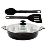 Frigideira Preto Liso Alumínio Usinado Talher 02 AA 30cm A linha de caçarolas usinadas se destacam pelo brilho interno das peças, resultante do processo da fabricação de alta qualidade. As caçarolas usinadas são fabricadas em alumínio fundido. Esse material é muito popular por oferecer um excelente custo benefício e por permitir um design versátil e prático, são muito procuradas pois possuem um preço competitivo e tem maior durabilidade. Faça seus alimentos mais saudáveis e saborosos com nossas caçarolas usinadas. Especificações Técnicas: Revestimento Externo: Alumínio Fundido Preto Liso.Revestimento Interno: Diamantado/Usinado.Alça Alumínio Tampa de Vidro.Diâmetro: 30cm.Peso: 2,05kg.Altura: 9cm. Especificações Técnicas Talheres:Modelos: Colher de Arroz e Espátula.Medidas: 28cm (Todos os modelos).Material: Nylon.Cor: Preto. Itens Inclusos:01 Frigideira Preto Liso Alumínio Usinado Talher 02 AA 30cm.01 Tampa de Vidro Temperado Avulsa 30cm. 02 Talheres em Nylon Antiaderente Preto. Código: 1227eT02JAV.ProdutoLojaPlast.