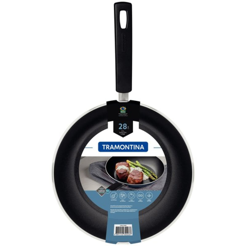 Frigideira Tramontina Sicília Alumínio Antiaderente Starflon Excellent Azul 28cm 2L Tramontina - Com a frigideira Tramontina Sicília em alumínio com revestimento interno e externo em antiaderente Starflon Excellent azul 28 centímetros de diâmetro 2 litros você deixa o preparo das suas refeições muito mais prático e proporciona maior beleza e estilo para sua cozinha. Ideal para uso diário, ela tem corpo desenvolvido em alumínio e conta 2,2 milímetros de espessura, características que juntas, proporcionam um cozimento rápido e uniforme dos alimentos. Seu cabo é em baquelite antitérmico, material que proporciona um manuseio mais confortável e seu revestimento é de antiaderente Starflon Excellent, que não gruda, é fácil de limpar, mais durável e não é prejudicial à saúde. Além de todas essas características, a frigideira pode ir à máquina de lavar louças, facilitando seu dia a dia na cozinha! Características Gerais do Produto: Garantia: • 3 Meses
