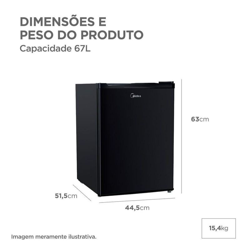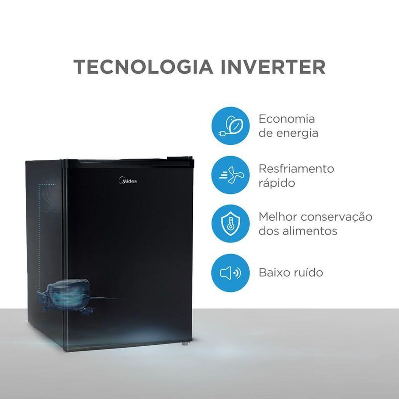 Frigobar 67 Litros Black Edition Inverter Bivolt Midea MDRD108FGD303 - BivoltO frigobar perfeito para quem valoriza desempenho e design em um único produto. Com 67 litros de capacidade, é compacto por fora e espaçoso por dentro, ideal para armazenar bebidas, alimentos e até garrafas de 2 litros.Conta com compartimento extra frio, prateleiras de vidro fáceis de limpar e controle de temperatura preciso com até 7 níveis — garantindo a temperatura ideal para bebidas e alimentos.Além disso, sua tecnologia oferece mais praticidade e economia:Tecnologia Flexi Volt: Funciona em 127V ou 220V.Tecnologia Inverter: Resfriamento rápido, baixo nível de ruído e alta eficiência energética (Classificação A – novo padrão Inmetro).Atnção: Esta loja não fatura para CNPJ.Especificações TécnicasMarca: MideaCapacidade Total: 67 LitrosCor: Preto (Black Edition)Cor Interna: BrancoMaterial Interno: PSAIMaterial Externo: Aço galvanizadoGás Ecológico: R600aTipo de Degelo: ManualTipo de Produto: SimCom Freezer: SimFunções: RefrigeraçãoControle de Temperatura: Interno (até 7 níveis)Range de Temperatura: 0°C a 10°CQuantidade de Portas: 1Porta Reversível: SimPés Niveladores: SimPossui Rodinhas: NãoProduto Conectado: NãoInteligência Artificial: NãoPrateleiras: 2 de vidro (fáceis de limpar)Porta-latas: SimPrateleiras para PETs: SimGavetas: NãoGaveta Organizadora: SimClassificação Energética 127V: AClassificação Energética 220V: AConsumo de energia (kWh/mês): 6,8 (em ambas tensões)Frequência: 60HzTipo de Tomada: 10AAltura: 63 cmLargura: 44,5 cmProfundidade: 51,5 cmPeso:15,4 kgAltura com Embalagem: 66,5 cmLargura com Embalagem: 46,5 cmProfundidade com Embalagem: 54,2 cmPeso: 17,2 kgConteúdo da Embalagem: Frigobar e Manual Garantia: 12 mesesCompressor: 10 anos (Garantia Estendida)