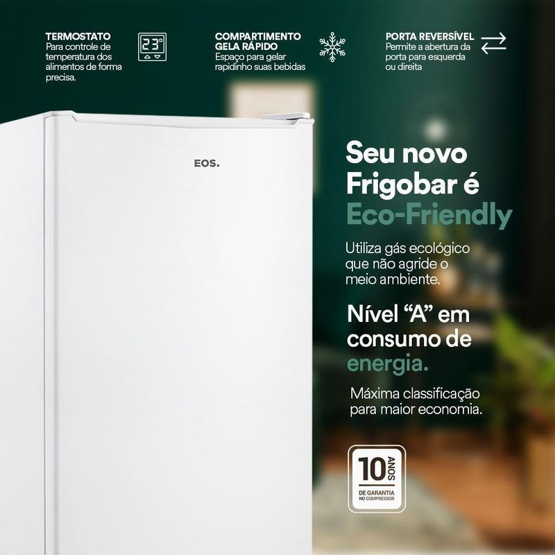 Frigobar Mini Refrigerador Doméstico Ice Compact 93l Efb101 127v Branco - Eos 127v MUITO IMPORTANTE:-- CONFERIR PRODUTOS NO ATO DO RECEBIMENTO. NÃO ACEITAR PRODUTOS COM EMBALAGEM VIOLADA (AMASSADO, RASGADO, ABERTO, QUEBRADO, ETC), A RECUSA DEVE SER FEITA NO ATO.Frigobar Mini Refrigerador Doméstico Ice Compact 93L Efb101 127vBranco - EOSVocê terá suas bebidas e alimentos prediletos sempre a mão. Compacto e versátil, cabe em vários cantinhos e combina com qualquer ambiente: seu quarto, sala ou escritório.Informações Adicionais:- Compartimento gela rápido;- Click Defrost: Degelo rápido em apenas um clique;- Termostato: Controla a temperatura dos alimentos de forma precisa;- Porta com compartimentos: Cabe uma garrafa 2L e até algumas bebidas em embalagens menores.Características Técnicas:- Refrigeração por compressor com gás ecológico- Baixo ruído.- Compartimento gela rápido.- Espaço para gelar rapidinho sua bebida predileta.- Cabe uma garrafa de dois litros, latas e outras bebidas.- Espaço interno otimizado.- Gaveta inferior no congelador para gelo.- 2 Prateleiras ajustáveis para você armazenar seus alimentos.- Ampla gaveta inferior multiuso para acomodar frutas e verduras.- Termostato: controla a temperatura dos alimentos de forma precisa.- Puxador superior que facilita a abertura e fechamento da porta.- Porta reversível, que permite abertura para esquerda ou direita.- Pés com ajuste de altura.- Dimensões (AxLxP): 84,3cm A x 44,4cm L x 48,6cm P.10 Anos de no compressor;1 Ano de no produto;Selo classe A de eficiência energética.Tamanho da embalagem: 88cm A x 52cm L x 46cm PPeso: 25kgPerguntas frequentes:- Possui iluminação interna?Não, este produto não possui iluminação interna.- Qual a faixa de temperatura?De 0° C à 10° C.- Quantas prateleiras?2 Prateleiras.- Como é painel de temperatura?O painel de temperatura é manual, não digital.Frigobar compacto, Mini refrigerador doméstico, Frigobar 93 litros, Frigobar branco, Frigobar 127V, Frigobar EOS, Refrigerador compacto, Refrigerador doméstico, Mini geladeira, Frigobar Ice Compact, Geladeira pequena, Frigobar para uso doméstico, Frigobar com capacidade de 93 litros, Frigobar com design compacto, Frigobar com baixo consumo de energia. Tensão Elétrica: 127v | Cor: Branco | Tipo de Degelo: Click Defrost | Produto: Frigobar | Tipo de Geladeira: Frigobar | Capacidade: 93L | Selecione: Frigobar Voltagem: 127V