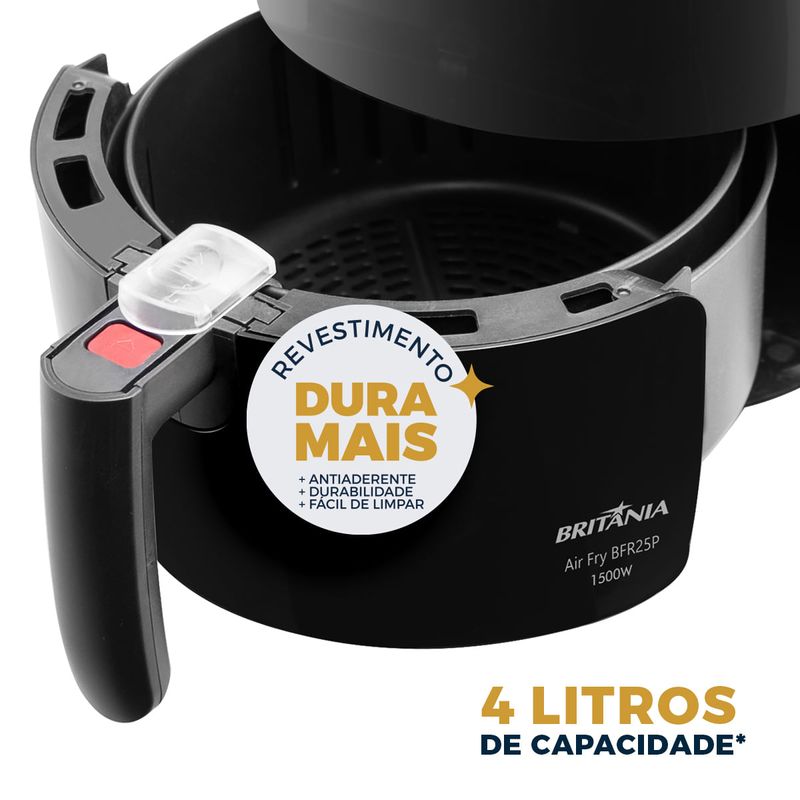 A Air Fryer Britânia BFR25P tem design moderno e vai deixar sua cozinha linda. Ela frita com pouquíssimo ou nenhum óleo garantindo refeições mais saudáveis com pouco trabalho. Capacidade de 4 litros total e cesto com 3,5 litros. Tecnologia Air Flow 360 graus é a circulação de ar quente em 360 graus, proporcionando mais agilidade e eficiência no preparo. Receitas prontas em menos de 5 minutos, crocância incrível por fora e suculência por dentro. O timer de 60 minutos facilita ainda mais, basta programar o tempo necessário para o preparo e aguardar, o desligamento é automático. Na hora de limpar também não tem esforço, o revestimento dura mais e não gruda! Mais antiaderente, mais durabilidade, mais fácil de limpar! É a Air Fryer Britânia 3,5L Revestimento Antiaderente 1500W BFR25P.Frita com pouquíssimo ou nenhum óleoSeletor de temperatura com ajuste de 80 a 200 grausTimer de 60 minutosCapacidade do cesto 3,5 litrosCapacidade da cuba de 4 litrosLuz indicadora de funcionamentoLuz indicadora de aquecimentoBase antiderrapanteCesto removívelCesto com revestimento antiaderenteSistema de proteção contra sobreaquecimentoComposição: Metal e Plástico.