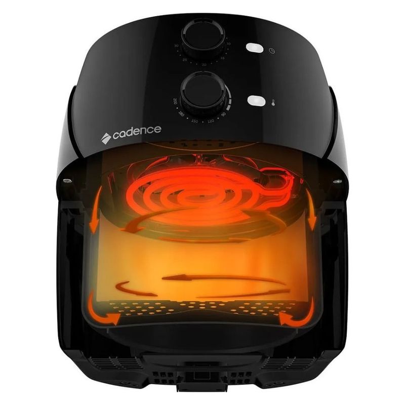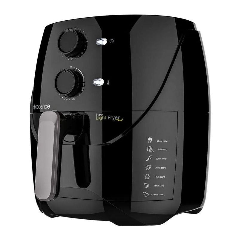 Fritadeira Airfryer Light 3,8 L. 1500w Frt555 Preto CadenceA Mobilar Eletro esta no mercado ha mais de 25 anos inovando em produtos e atendimento estabelecendo uma relacao de confianca!A Fritadeira Sem Oleo Super Light Fryer vai deixar a sua alimentacao mais leve e facilitar a sua vida. E moderna e torna sua cozinha muito mais agradavel visualmente, nao deixando mau cheiro de gordura no ambiente, vai deixar a sua alimentacao mais leve, facilitar a sua vida e ainda tornar o seu jeito de fazer comida muito mais pratico e gostoso.Alem de compacta e facil de usar, a fritadeira esta com novo design e vai dar um toque moderno na sua cozinha.Agora voce tera mais prazer em comer aquele alimento que tanto deseja sem se preocupar com o excesso de oleo, pois a fritadeira e totalmente livre de oleo, deixando seu alimento crocante, saboroso e mais saudavel. Gostou ne? Aproveite essa oportunidade e turbine suas receitas!Quer mais beneficios? Com capacidade de 3,2 Litros ela e ideal para voce fritar: Carnes, legumes recheados, frango frito, polenta frita e nuggets. Nao se preocupe mais em queimar seu alimento, porque a fritadeira dispoe de funcoes que temporizam. na temperatura exata que escolher com 7 niveis diferentes.Fritadeira sem oleo, , saudavel, airfryer, tamanho familiaCompre agora mesmo com a Mobilar Eletro!Caracteristicas do produto:Marca: CadenceMaterial/Composicao: PlasticoAlimentacao: Energia eletricaConsumo (KW/h): 1,5Kw/hCapacidade: 3,2 LitrosPotencia (W): 1500WVoltagem: 220VCaracteristicas: TimerTipo de Churrasqueira: EletricaTipo de alimentos que comporta: Carnes, legumes recheados, frango frito, polenta frita, nuggets, onion rings, mini pizzas, almondegas, bolos, muffins, churros, entre outros alimentosPode ser levado a mesa: SimTempo de cozimento/preparo: De acordo com o alimentoPossui tampa: SimConteudo da Embalagem:01 Fritadeira Eletrica