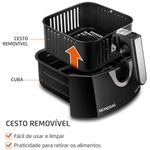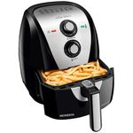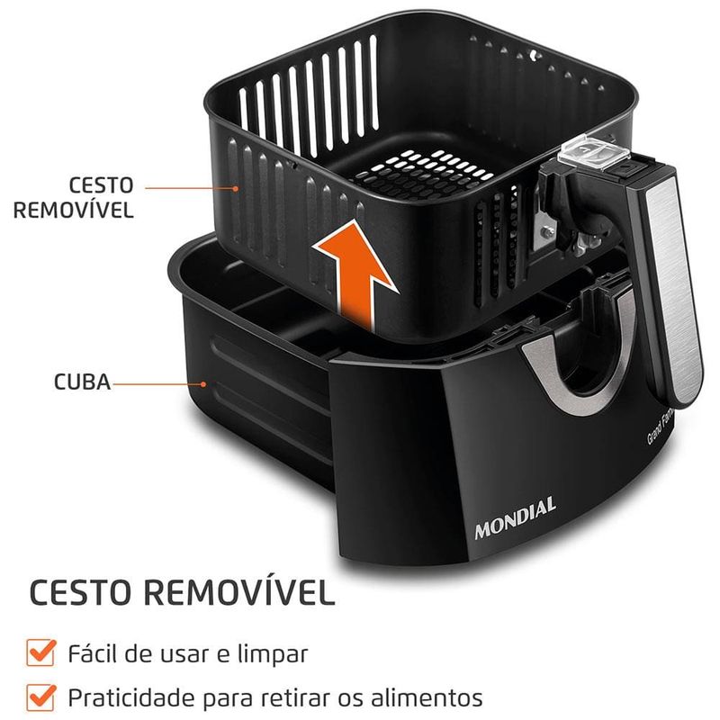 A Fritadeira Elétrica Sem Óleo Air Fryer Mondial Grand Family AF-55I 5,5L leva mais praticidade e menos sujeira na hora de fazer frituras. Sem usar óleo, ela cozinha, assa e frita alimentos através de ar quente, com resultados repletos de sabor e crocantes. As receitas ficam mais saudáveis e a cozinha fica livre de fumaça e cheiro de gordura, sem falar no óleo respingado no fogão. Para acertar no tempo, basta conferir o indicativo de temperatura e tempo de cozimento. O timer tem alcance de até 60 minutos e após alcançar o tempo informado, desliga automaticamente, assim, fica tranquilo para realizar outras tarefas, enquanto a Fritadeira Sem Óleo Air Fryer Mondial Grand Family prepara sua refeição. A Grand Family da Mondial tem capacidade total para até 5,5 litros, perfeita para fazer receitas de todos os tamanhos, inclusive petiscos e porções de fritas para reunir toda a família. Bonita, moderna, com acabamento em aço inox, tem cesto com antiaderente Duraflon, fácil de limpar, pois os alimentos não grudam. O sistema de aquecimento é inteligente, assim, uma luz verde acenderá e logo que atingir o preaquecimento ideal, a luz desliga para iniciar o preparo.Fácil de manusear, o painel acompanha o controle de temperatura e de tempo, além disso, possui indicativo e sugestão de tempo para porções de 100 a 200 gramas. Tenha muito mais autonomia na hora de cozinhar, e, verifique no livro de receitas todas as possibilidades de receitas que a Fritadeira Sem Óleo Air Fryer Mondial Grand Family AF-55I 5,5Lé capaz e surpreenda-se.