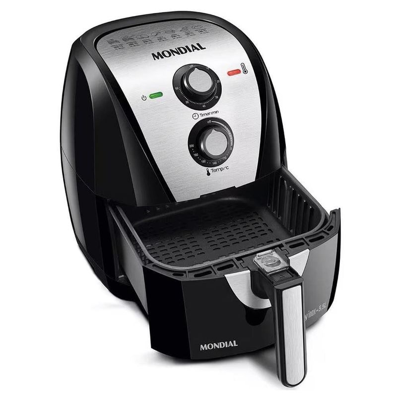A Fritadeira Elétrica Sem Óleo Air Fryer Mondial Grand Family AF-55I 5,5L leva mais praticidade e menos sujeira na hora de fazer frituras. Sem usar óleo, ela cozinha, assa e frita alimentos através de ar quente, com resultados repletos de sabor e crocantes. As receitas ficam mais saudáveis e a cozinha fica livre de fumaça e cheiro de gordura, sem falar no óleo respingado no fogão. Para acertar no tempo, basta conferir o indicativo de temperatura e tempo de cozimento. O timer tem alcance de até 60 minutos e após alcançar o tempo informado, desliga automaticamente, assim, fica tranquilo para realizar outras tarefas, enquanto a Fritadeira Sem Óleo Air Fryer Mondial Grand Family prepara sua refeição. A Grand Family da Mondial tem capacidade total para até 5,5 litros, perfeita para fazer receitas de todos os tamanhos, inclusive petiscos e porções de fritas para reunir toda a família. Bonita, moderna, com acabamento em aço inox, tem cesto com antiaderente Duraflon, fácil de limpar, pois os alimentos não grudam. O sistema de aquecimento é inteligente, assim, uma luz verde acenderá e logo que atingir o preaquecimento ideal, a luz desliga para iniciar o preparo.Fácil de manusear, o painel acompanha o controle de temperatura e de tempo, além disso, possui indicativo e sugestão de tempo para porções de 100 a 200 gramas. Tenha muito mais autonomia na hora de cozinhar, e, verifique no livro de receitas todas as possibilidades de receitas que a Fritadeira Sem Óleo Air Fryer Mondial Grand Family AF-55I 5,5Lé capaz e surpreenda-se.