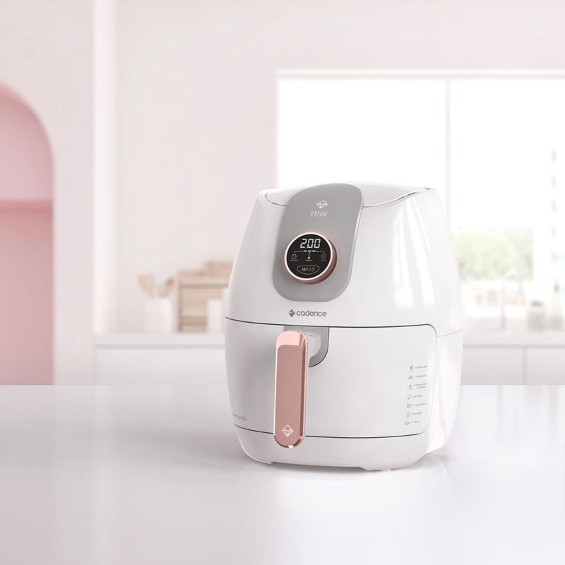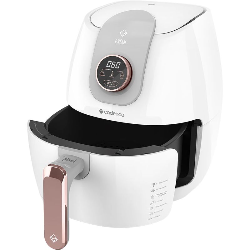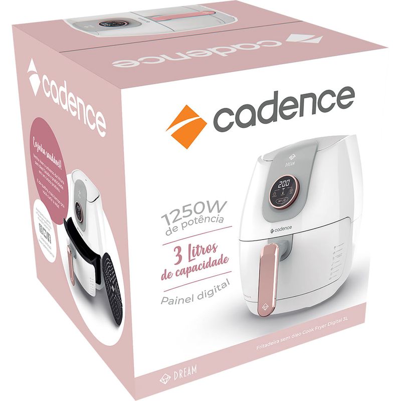 Sonho e glamour na sua cozinha! A única em Rosé Gold. Uma cor exclusiva para transformar a sua cozinha. A Fritadeira Cadence Dream tem 3L de capacidade, espaço de sobra para carnes, bolos, empanados, legumes e muito mais. Tem botão digital com 7 funções pré programadas para simplificar ainda mais a sua vida e muito mais saúde com o cozimento por convecção, que frita os alimentos com ar quente, sem uso de óleo. São 7 funções para cozinhar, com um visual de arrasar. Cor exclusiva: Em Rosé Gold, Easter Eggs, Venda exclusiva pelo site, Grelha removível, Base antiderrapante, 1 ano de garantia, 1250W: Potência e velocidade de preparo, 3l de capacidade, Botão Digital com 7 funções pré programadas: Reaquecer, descongelar, batata frita congelada, frango, carne, peixe, cupcake. Timer ajustável: Até 60 min, Seletor de temperatura: De 80 a 200 graus, Embalagem surpresa: Mimos faça você mesmo, Grelha removível, Base antiderrapante, 1 ano de garantia. Dica de uso: Somente na primeira vez que usar, unte o interior do cesto com óleo e aqueça por 3 minutos. Isto vai ajudar a durabilidade do revestimento antiaderente. Selo de Segurança OCP SGS.