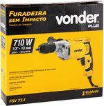 Marca: VonderConteúdo da embalagem:1 Furadeira sem impacto. Acompanha: 1 punho auxiliar.Destaques e diferenciais:Possui interruptor eletrônico com pré-seleção de velocidade para controle da rotação da máquina, possibilitando iniciar um furo com uma rotação baixa e aumentar gradativamente de acordo com a necessidade de perfuração. Conta também com sistema reversível, que facilita a retirada da broca caso ela trave durante a perfuração. Possui botão trava do interruptor para trabalhos contínuos, punho auxiliar e motor com dupla isolação, que garante maior segurança.Aplicações e dicas de uso:Uso industrial. Indicada para madeiras, metais, entre outros, deve ser utilizada com os acessórios adequados. Não indicada para furar concreto.Detalhes TécnicosModelo: FSV 712 Potência: 710 W Tipo de mandril: Aperto rápido Capacidade do mandril: 1/2" - 13 mm Sistema de reversão: Sim Tipo de velocidade: Variável Rotações por minuto (rpm): 0 - 2.200/min Capacidade máxima de perfuração em aço: 13,0 mm Capacidade máxima de perfuração em madeira: 35,0 mm Tensão (V): 220 V~ Frequência (Hz): 50 Hz/60 Hz Incerteza da aceleração transmitida nas mãos - braços do operador - k: 1,5 m/s² Aceleração transmitida nas mãos - braços do operador - ah: 2,326 m/s² Segue norma: ABNT NBR IEC 60745-1 e ABNT NBR IEC 60745-2-1 Massa aproximada (peso) (kg): 2,0 kg Garantia - E (CDC):Garantia legal: 90 dias + Garantia contratual: 9 meses (Para locadoras, garantia única e exclusiva de 90 dias)