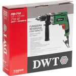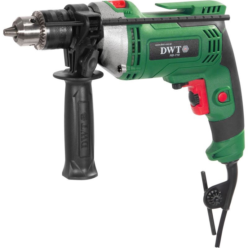 Marca: DWTConteúdo da Embalagem:1 Furadeira com impacto, acompanha: 1 chave para mandril, limitador de profundidade e punho auxiliarDestaques e diferenciais:Possui interruptor eletrônico com pré-seleção de velocidade, o qual permite controlar a rotação da máquina, possibilitando iniciar o furo com uma rotação baixa e aumentar gradativamente de acordo com a necessidade de perfuração. Conta também com sistema reversível, que facilita a retirada da broca caso ela trave durante a perfuração. Possui botão trava do interruptor para trabalhos contínuos, punho auxiliar e limitador de profundidade, conferindo maior praticidade ao operador. Conta ainda com motor com dupla isolação, que garante maior segurança.Aplicações e dicas de uso:Indicada para metal e madeira na função sem impacto e na função com impacto para concreto e alvenaria. Deve ser utilizada com acessórios adequados. Características Técnicas:Potência (W): 710 W Capacidade do mandril: 1/2" - 13 mm Tipo de velocidade: Variável Tensão (V): 220 V