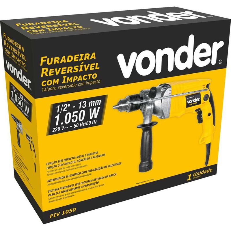 Furadeira de Impacto 1/2", 1.050 W, 220 V~, FIV 1050 Vonder 220 V~ OstenVonder - Conteúdo da embalagem: 1 Furadeira de impacto. Acompanha: 1 chave para mandril, 1 limitador de profundidade e 1 punho auxiliar. Aplicação: Indicada para metal e madeira na função sem impacto e na função com impacto para concreto e alvenaria. Deve ser utilizada com acessórios adequados. Destaques: Possui interruptor eletrônico com pré-seleção de velocidade, que permite controlar a rotação da máquina possibilitando iniciar um furo com uma rotação baixa e aumentar gradativamente de acordo com a necessidade de perfuração. Possui ainda sistema reversÃvel, que facilita a retirada da broca caso ela trave durante a perfuração. Conta com botão trava do interruptor para trabalhos contÃnuos, punho auxiliar e limitador de profundidade, conferindo maior praticidade. Conta ainda com cabo com revestimento emborrachado, proporcionando maior conforto ao operador, e motor com dupla isolação que proporciona mais segurança. Garantia - E (CDC): Garantia legal: 90 dias + Garantia contratual: 9 meses (Para locadoras, garantia única e exclusiva de 90 dias) Referência: 6001105220 Modelo: FIV 1050 Potência: 1.050 W Rotações por minuto - rpm: 0 - 3.000/min Massa aproximada (peso): 3,30 kg Sistema de reversão: Sim Tensão (V): 220 V~ Tipo de velocidade: Variável Tipo de mandril: Com chave Capacidade do mandril: 1/2" - 13 mm Capacidade máxima de perfuração em madeira: 30 mm Impactos por minuto (ipm): 0 - 44.800/min Capacidade máxima de perfuração em concreto: 20 mm Capacidade máxima de perfuração em aço: 13 mm Segue norma: ABNT NBR IEC 60745-1 e ABNT NBR IEC 60745-2-1 Frequência: 50 Hz / 60 Hz Aceleração transmitida nas mãos - braços do operador - ah: 2,2 m/s² Incerteza da aceleração transmitida nas mãos - braços do operador - k: 1,5 m/s² Destaques Comercial: Interruptor eletrônico com controle de rotação, sistema reversÃvel, trava para uso contÃnuo, punho auxiliar, limitador de profundidade e motor com dupla isolação para conforto e segurança. Aplicação Comercial: Indicada para metal e madeira sem impacto e para concreto e alvenaria com impacto, usando acessórios adequados. Características Gerais do Produto: Garantia: • 3 Meses
