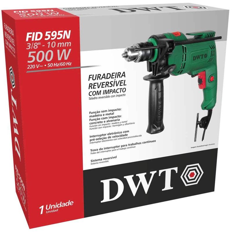 Furadeira de Impacto 3/8", 500 W, 220 V~, FID 595n DWT 220 V~ OstenVonder - Conteúdo da embalagem: 1 Furadeira de impacto. Acompanha: 1 chave para mandril, limitador de profundidade e punho auxiliar. Aplicação: Indicada para metal e madeira na função sem impacto e na função com impacto para concreto e alvenaria. Deve ser utilizada com acessórios adequados. Destaques: Possui interruptor eletrônico com pré-seleção de velocidade, o qual permite controlar a rotação da máquina, possibilitando iniciar o furo com uma rotação baixa e aumentar gradativamente de acordo com a necessidade de perfuração. Conta também com sistema reversÃvel, que facilita a retirada da broca caso ela trave durante a perfuração. Possui botão trava do interruptor para trabalhos contÃnuos, punho auxiliar e limitador de profundidade, conferindo maior praticidade ao operador. Conta ainda com motor com dupla isolação, que garante maior segurança. Garantia - E (CDC): Garantia legal: 90 dias + Garantia contratual: 9 meses (Para locadoras, garantia única e exclusiva de 90 dias) Referência: 6005595220 Sistema de reversão: Sim Tensão (V): 220 V~ Tipo de velocidade: Variável Tipo de mandril: Com chave Capacidade do mandril: 3/8" - 10 mm Capacidade máxima de perfuração em madeira: 20 mm Impactos por minuto (ipm): 0 - 44.800/min Capacidade máxima de perfuração em concreto: 10 mm Capacidade máxima de perfuração em aço: 8 mm Frequência: 50 Hz / 60 Hz Aceleração transmitida nas mãos - braços do operador - ah: 2,2 m/s² Incerteza da aceleração transmitida nas mãos - braços do operador - k: 1,5 m/s² Modelo: FID 595N Potência: 500 W Segue norma: ABNT NBR IEC 60745-1 e ABNT NBR IEC 60745-2-1 Rotações por minuto - rpm: 0 - 2.800/min Destaques Comercial: Interruptor eletrônico com controle de rotação, sistema reversÃvel, trava para uso contÃnuo, punho auxiliar, limitador de profundidade e motor com dupla isolação para segurança e praticidade. Aplicação Comercial: Para perfuração em metal e madeira sem impacto e em concreto e alvenaria com impacto, usando acessórios adequados. Características Gerais do Produto: Garantia: • 3 Meses