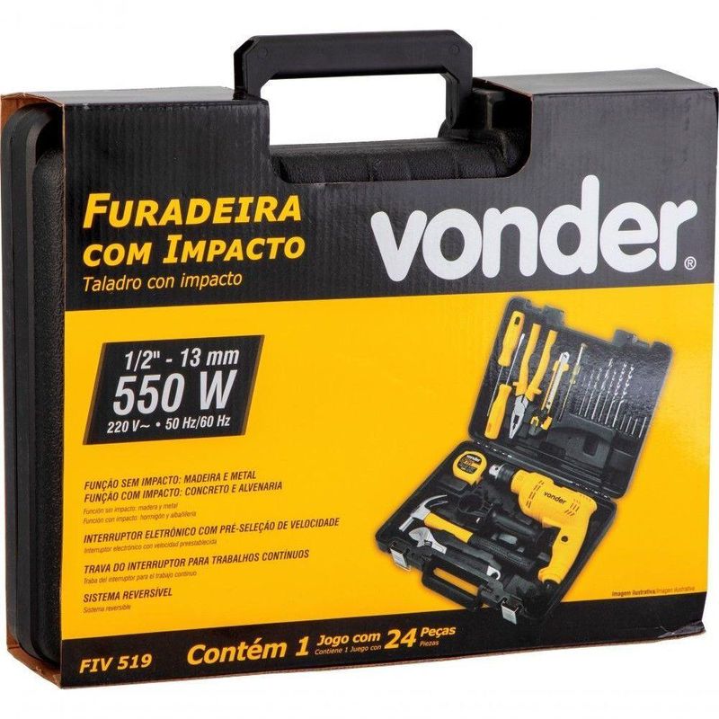 Furadeira Impacto 1/2'' Fiv 519 19 Acessórios 220V VonderMarca: VonderCódigo: 6001519220Conteúdo da embalagem1 Furadeira com impacto, acompanha: 1 maleta plástica, 1 punho auxiliar, 1 chave para mandril, 1 limitador de profundidade, 1 alicate universal 8 CRV 1.000 V, 1 trena 5 m, 1 chave ajustável 8, 1 martelo unha 20 mm com cabo de fibra, 1 estilete 18 mm, 1 chave de fenda 1/4 x 4 CRV, 1 chave phillips 1/4 x 4 CRV, 1 chave teste, 4 brocas para madeira 3 pontas (4 mm, 5 mm, 6 mm e 8 mm), 4 brocas de aço rápido (4 mm, 5 mm, 6 mm e 8 mm) e 3 brocas para concreto (6 mm, 8 mm e 10 mm).Destaques e diferenciais:Acompanha 19 acessórios encaixados perfeitamente na maleta, conferindo organização, praticidade e maior vida útil dos acessórios. Conta com furadeira com interruptor eletrônico com pré-seleção de velocidade, o qual permite controlar a rotação da máquina, possibilitando iniciar um furo com uma rotação baixa e aumentar gradativamente de acordo com a necessidade de perfuração. Conta ainda com sistema reversível, que facilita a retirada da broca caso ela trave durante a perfuração. Possui botão trava do interruptor para trabalhos contínuos, punho auxiliar e limitador de profundidade, conferindo maior praticidade ao operador. Além de motor com dupla isolação, que garante maior segurança.Aplicações e dicas de uso:Indicada para metal e madeira na função sem impacto e, na função com impacto, para concreto e alvenaria. Deve ser utilizada com acessórios adequados.Modelo: FIV 519 Potência: 550 W Tipo de mandril: Com chave Capacidade do mandril: 1/2 - 13 mm Sistema de reversão: Sim Tipo de velocidade: Variável Rotações por minuto (rpm): 0 - 2.800/min Impactos por minuto (ipm): 0 - 44.800/min Capacidade máxima de perfuração em aço: 13 mm Capacidade máxima de perfuração em madeira: 20 mm Capacidade máxima de perfuração em concreto: 13 mm Tensão (V): 220 V~ Frequência (Hz): 50 Hz/60 Hz Aceleração transmitida nas mãos - braços do operador - ah: 3,01 m/s² Incerteza da aceleração transmitida nas mãos - braços do operador - k: 1,5 m/s² Segue norma: ABNT NBR IEC 60745-1 e ABNT NBR IEC 60745-2-1 Massa aproximada (peso) (kg): 1,80 kgGarantia - E (CDC):Garantia legal: 90 dias + Garantia contratual: 9 meses (Para locadoras, garantia única e exclusiva de 90 dias) Produto: Furadeira