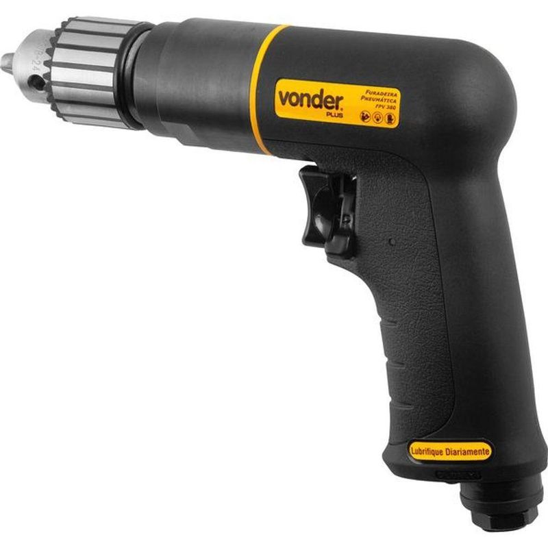 Furadeira Pneumática Fpv380 - Vonder PlusConteúdo da Embalagem:1 Furadeira pneumáticaAplicações e dicas de uso:Indicada para perfurações em madeira e metal. Mantenha a ferramenta constantemente lubrificada e utilize sempre o regulador de pressão e o lubrificador de linha com óleo pneumático.Detalhes Técnicos:Consumo de ar da furadeira pneumática: 5,5 pcm (pé³/min) Pressão de trabalho (PSI): 90 lbf/pol² Capacidade do mandril da furadeira: 3/8 Diâmetro e tipo da rosca de entrada de ar da furadeira pneumática: 1/4 NPT fêmeaGarantia legal: 90 dias + Garantia contratual: 3 meses Voltagem: Pneumático