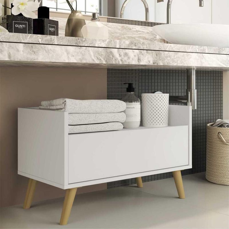 O Gabinete Armário Banheiro 60 cm com Pés Retrô Multimóveis é uma solução prática para você aproveitar aquele espaço restrito e complementar seu ambiente. Produzido em MDP com acabamento acetinado (cerca de 20% de brilho), que garante maior durabilidade e facilidade na limpeza, possui 1 gaveta com amplo espaço interno e corrediças metálicas que proporcionam mais leveza no manuseio. Os pés retrô, em polipropileno, dão um charme especial ao móvel deixando-o com um visual leve e permitindo você compor um ambiente com ar vintage e moderno ao mesmo tempo. Seu design clean permite que ele seja utilizado em diferentes ambientes, adaptando-se conforme sua necessidade.Conteúdo da Embalagem:1 (um) balcão1 (um) kit com 4 pés retrôDimensões do produto montado:Altura: 47cm | Largura: 60cm | Profundidade: 36cm*Você pode consultar as medidas internas na imagem técnica do produto.Disponível em 6 opções de cores:Branco Branco/Preto Branco/l Preto Texturizado Preto Texturizado/Branco Preto Texturizado/l*As cores do produto podem sofrer variações de tonalidade de acordo com as configurações do seu dispositivo.Imagem meramente ilustrativa. Decoração não acompanha o produto.O produto será entregue desmontado e não disponibilizamos o de montagem.