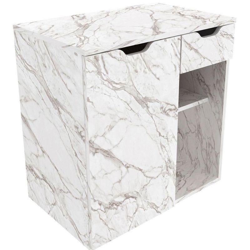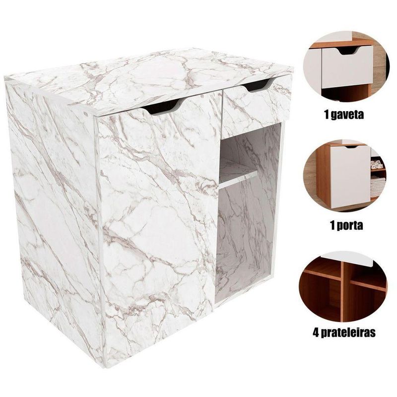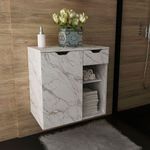 Gabinete De Banheiro 60 Cm 1 Porta 1 Gaveta Romana Mármore BrancoO Gabinete de Banheiro Romana de 60 cm traz um visual elegante com design moderno que valoriza qualquer ambiente. Seu acabamento em pintura UV garante um toque sofisticado, além de maior resistência e durabilidade ao móvel. Com estrutura robusta em mdp, o gabinete alia estilo e funcionalidade na medida certa para banheiros compactos ou médios.Dimensões do Gabinete Suspenso para Banheiro:- Altura: 61,5 cm- Largura: 60 cm- Profundidade: 38,7 cmCaracterísticas do Armário de Banheiro Suspenso 60 cm:- Estrutura em mdp;- Acabamento em pintura UV;- 1 porta de bater;- 1 gaveta com corrediça metálica;- 4 prateleiras;- Suporta 10 kg tampo e 3 kg cada prateleira/gaveta;- Não acompanha cuba;- Não acompanha objetos de decoração;- Não nos responsabilizamos pela montagem dos produtos. Todos os produtos acompanham acessórios para que sejam montados.- Não nos responsabilizamos, no ato da entrega, por subir escadas/elevadores ou transporte por guincho em apartamentos. Eventuais despesas são de responsabilidade do comprador;- Confira as dimensões deste produto e certifique-se de que passará normalmente por supostos elevadores, portas, escadas e/ou corredores de sua residência- Não aceitamos devolução após o período de arrependimento de 7 dias corridos.Características Gerais do Produto: - Altura: 61,5 cm - Ideal para: Banheiro - Informações Adicionais: 1 gaveta com corrediça metálica/4 prateleiras/Não acompanha cuba - Largura: 60 cm - Material: Estrutura em MDP - Portas: 1 Porta - Profundidade: 38,7 cm - Tipo de Porta: Porta de Bater - Acabamento: Acabamento em pintura UV - Informações Adicionais: - Não nos responsabilizamos pela montagem dos produtos. Todos os produtos acompanham acessórios para que sejam montados. - Não nos responsabilizamos, no ato da entrega, por subir escadas/elevadores ou transporte por guincho em apartamentos. Eventuais despesas são de responsabilidade do comprador; - Confira as dimensões deste produto e certifique-se de que passará normalmente por supostos elevadores, portas, escadas e/ou corredores de sua residência; - Não aceitamos devolução de produtos com caixas violadas ou materiais danificados, confira a quantidade de volumes e se o que está sendo entregue corresponde com a mercadoria adquirida, não aceitamos devolução após o período de arrependimento de 7 dias corridos.Acompanha o produto: - 1 x Gabinete de Banheiro 60 cm 1 Porta 1 Gaveta Romana Manual de MontagemAcessórios de MontagemGarantia: - 3 Meses