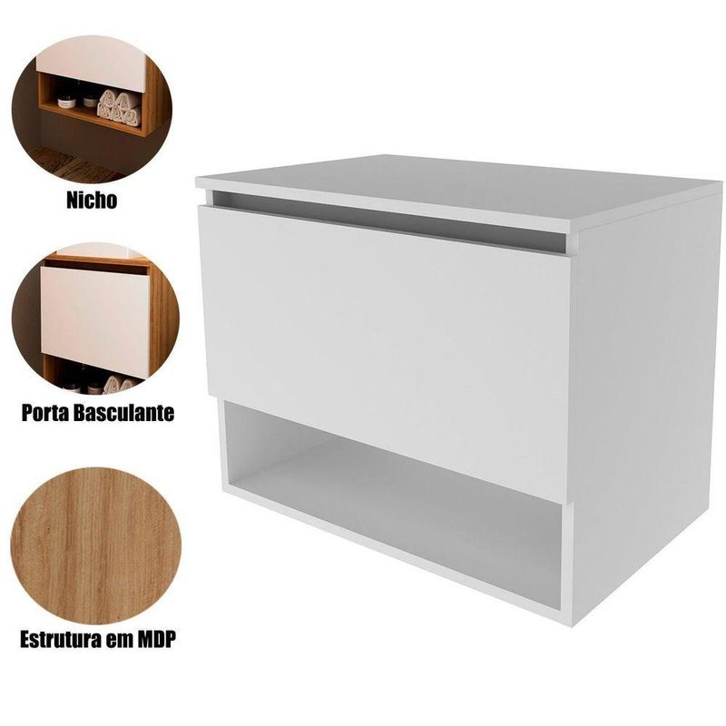 Gabinete De Banheiro 60 Cm 1 Porta E Nicho Valente BrancoO Gabinete de Banheiro 60 cm 1 Porta e Nicho Valente é a escolha ideal para quem busca funcionalidade aliada a um visual contemporâneo. Com linhas limpas e estrutura compacta, ele se adapta facilmente a diferentes estilos de banheiro, valorizando o ambiente com sofisticação.Dimensões do Gabinete Suspenso para Banheiro:- Altura: 46,5 cm- Largura: 60 cm- Profundidade: 38,7 cmCaracterísticas do Armário de Banheiro 60 cm com Nicho:- Estrutura em mdp;- Acabamento em pintura UV;- 1 porta basculante;- Nicho;- Suporta 10 kg no tampo e 3 kg cada gaveta;- Não acompanha cuba;- Não acompanha objetos de decoração;- Não nos responsabilizamos pela montagem dos produtos. Todos os produtos acompanham acessórios para que sejam montados.- Não nos responsabilizamos, no ato da entrega, por subir escadas/elevadores ou transporte por guincho em apartamentos. Eventuais despesas são de responsabilidade do comprador;- Confira as dimensões deste produto e certifique-se de que passará normalmente por supostos elevadores, portas, escadas e/ou corredores de sua residência- Não aceitamos devolução após o período de arrependimento de 7 dias corridos.Características Gerais do Produto: - Altura: 46,5 cm - Ideal para: Banheiro - Informações Adicionais: Nicho/Não acompanha cuba - Largura: 60 cm - Material: Estrutura em MDP - Portas: 1 Porta - Profundidade: 38,7 cm - Tipo de Porta: Porta Basculante - Acabamento: Acabamento em pintura UV - Informações Adicionais: - Não nos responsabilizamos pela montagem dos produtos. Todos os produtos acompanham acessórios para que sejam montados. - Não nos responsabilizamos, no ato da entrega, por subir escadas/elevadores ou transporte por guincho em apartamentos. Eventuais despesas são de responsabilidade do comprador; - Confira as dimensões deste produto e certifique-se de que passará normalmente por supostos elevadores, portas, escadas e/ou corredores de sua residência; - Não aceitamos devolução de produtos com caixas violadas ou materiais danificados, confira a quantidade de volumes e se o que está sendo entregue corresponde com a mercadoria adquirida, não aceitamos devolução após o período de arrependimento de 7 dias corridos.Acompanha o produto: - 1 x Gabinete de Banheiro 60 cm 1 Porta e Nicho ValenteManual de MontagemAcessórios de MontagemGarantia: - 3 Meses