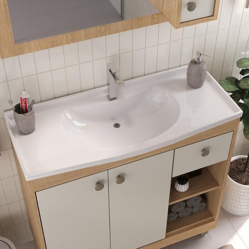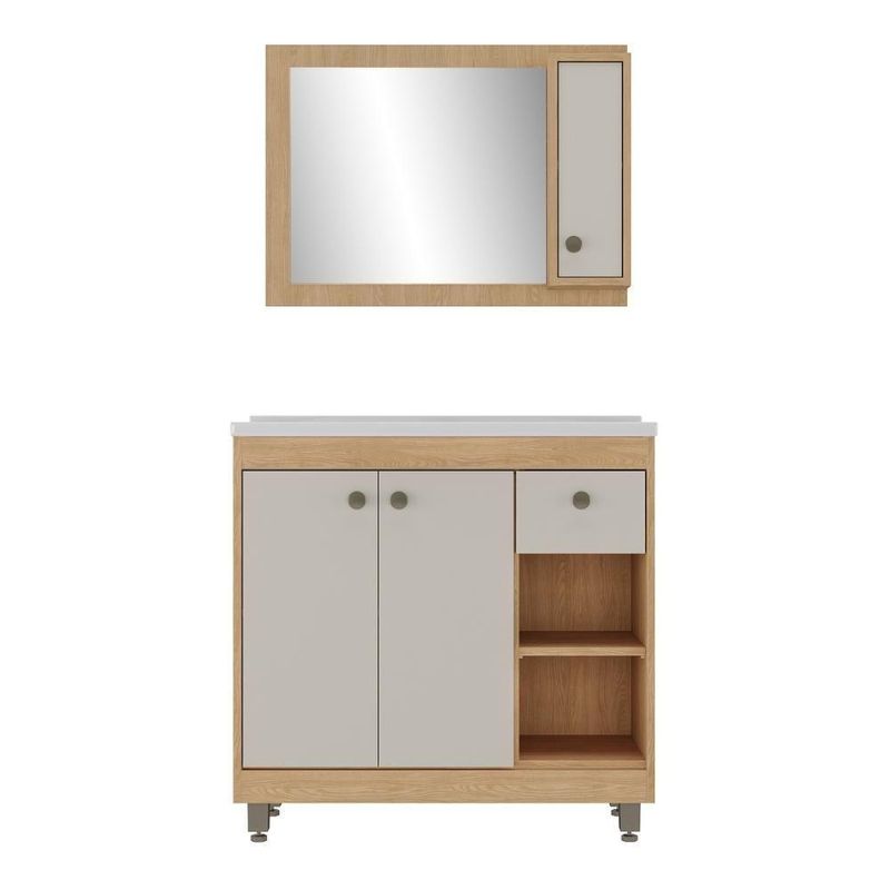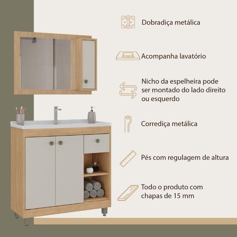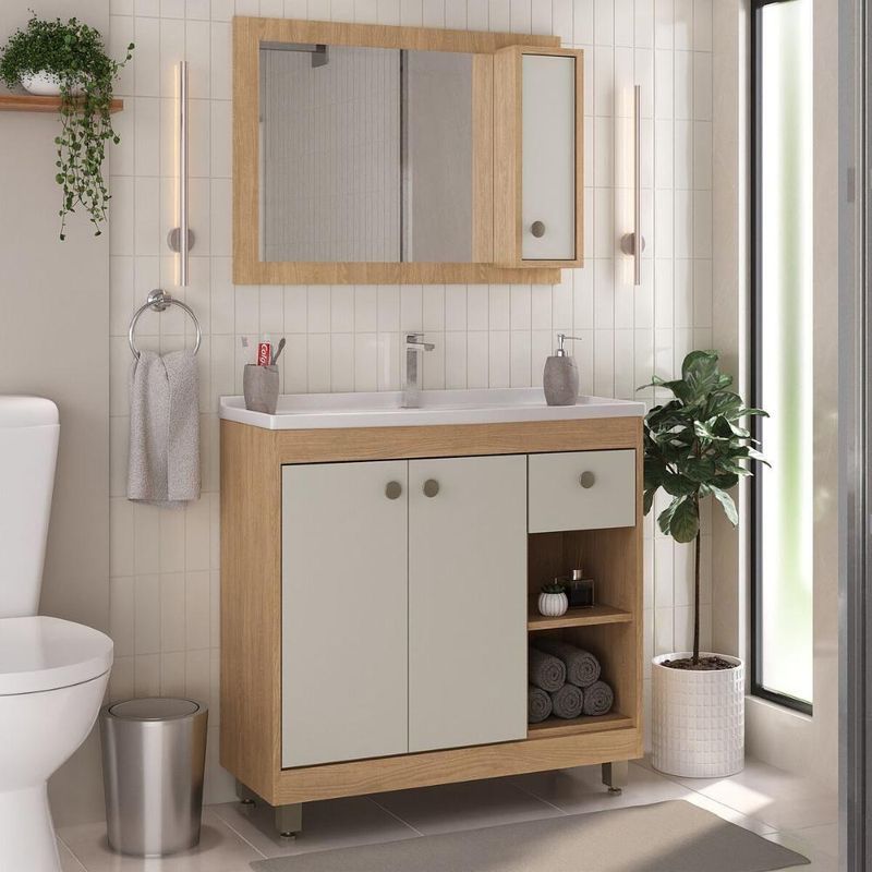 Gabinete De Banheiro Com Cuba E Espelheira 80cm Multimóveis Cr10134 Carvalho Nature-arenas Com um design clean, o Gabinete de Banheiro com Cuba e Espelheira 80cm Multimóveis CR10134 é uma solução prática para banheiros com espaços menores. Produzido em MDP de 15mm com acabamento semibrilho, que garante maior durabilidade e facilidade de limpeza. Possui 3 portas e amplo espaço interno. Os pés com regulagem de altura facilitam o nivelamento e a limpeza do produto. A espelheira conta com um sistema que permite a montagem do nicho tanto para o lado direito, quanto para o lado esquerdo, dependendo da necessidade de cada cliente.Conteúdo da Embalagem:1 (um) Balcão com Cuba1 (uma) EspelheiraManual de MontagemKit FerragemDimensões do produto montado:Espelheira - Altura: 52cm | Largura: 72cm | Profundidade: 13,5cmBalcão com Cuba - Altura: 80cm | Largura: 80cm | Profundidade: 32cm*Você pode consultar as medidas detalhadas na imagem técnica do produto.*As cores do produto podem sofrer variações de tonalidade de acordo com as configurações do seu dispositivo.Imagem meramente ilustrativa. Decoração e torneira não acompanham o produto.