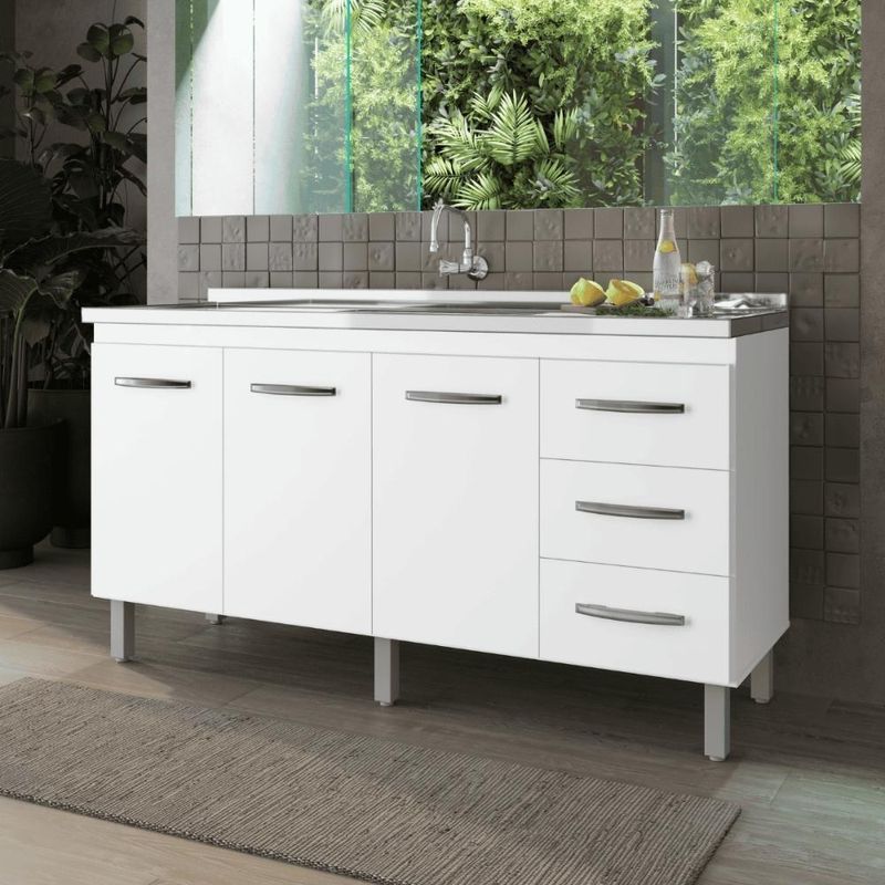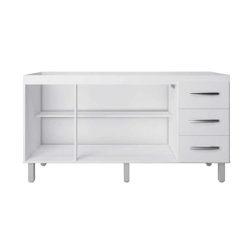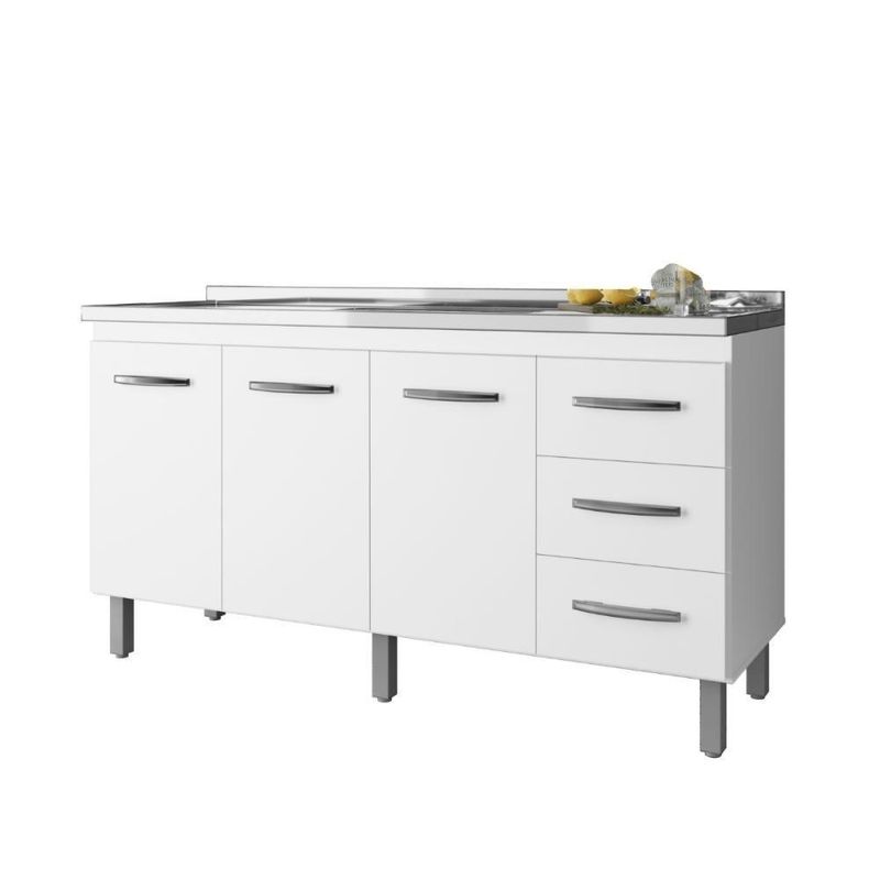 Gabinete De Cozinha Para Pia 3 Portas 3 Gavetas BrancoO Balcão possui um perfeito design moderno, compartimento com amplo espaço interno para acomodar utensílios, panelas, eletrodomésticos pequenos e muito mais.Dimensões do Balcão:Altura: 82,70 cmLargura: 158 cmProfundidade: 50 cmInformações do Balcão:Portas: Sim (3)Gavetas: Sim (3)Pés: Sim (5)Pintura em UVPuxadoresMaterial Principal: MDPItens Inclusos:1 BalcãoManual de MontagemKit completo para montagem e manual de instruçõesGarantia:3 meses contra defeito de fabricaçãoInformações Adicionais:- Fotos meramente ilustrativas do produto no ambiente.- Os objetos que ambientam as fotos não acompanham o produto;- Verificar descrição e tamanho do produto antes da compra.- Avaliar a mercadoria no ato do recebimento e recuse em caso de divergência ou avarias.- Mantenha as informações de contato e endereço de entrega atualizados para entrarmos em contato caso necessário.- Limpar com flanela ou pano macio seco, não utilizar produtos abrasivos, desengordurantes, álcool ou solvente. Não expor o produto diretamente à luz solar e à umidade.* Sugerimos a contratação de um montador profissional para a montagem do produto. Não nos responsabilizamos por avarias causadas no ato da montagem.* Não nos responsabilizamos pela montagem e desmontagem do produto no ato da entrega e devolução, assim como os custos gerados nestas situações.* A transportadora entregará o produto no andar térreo do endereço de entrega.* Não nos responsabilizamos por subir escadas, corredores e elevadores ou transporte por guincho em apartamentos. LARGURA DO PRODUTO (CM): 158 | ALTURA DO PRODUTO (CM): 82,7 | COR PREDOMINANTE: marrom | PESO DO PRODUTO (KG): 34,5 | CORES DO PRODUTO (FILTRO DE CORES): marrom | CONTEÚDO DA EMBALAGEM: Um balcão de cozinha | COMPRIMENTO DO PRODUTO (CM): 50 | INSTRUÇÕES/CUIDADOS: Limpar com pano macio e seco, não utilizar produtos abrasivos. | MODELO: Balcão de cozinha | ESTADO DE ORIGEM: PR | PESO PRODUTO COM EMBALAGEM (KG): 34,5 | MATERIAL PRINCIPAL: MDP | LARGURA PRODUTO COM EMBALAGEM (CM): 49 | MATERIAL PARA FILTRO: MDP | COMPRIMENTO PRODUTO COM EMBALAGEM (CM): 159 | MARCA: CASAH | TIPOS DE MÓVEIS DE COZINHA: Balcão | PRODUTO PRECISA DE MONTAGEM?: Sim, a montagem é simples mas sugerimos a contratação do nosso serviço de montagem (para os CEPs em que o serviço está disponível) ou de algum profissional experiente de sua preferência | ALTURA DO PRODUTO COM EMBALAGEM (CM): 9 Cor: Branco