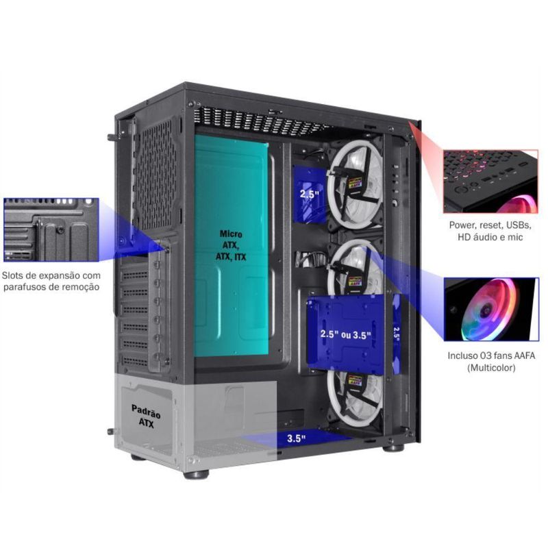 Gabinete Gamer Kmex Cg-a1tp Led RgbGabinete Gamer Kmex CG-A1TP Led RGBMarca: K-MEX Modelo: CG-A1TP EAN: 7908347906531ESPECIFICAÇÕES TÉCNICAS:Placa mãe : ATX, MICRO ATX, ITX. Dimensões do chassi (AxLxP): 395*180*320mm Dimensões do gabinete (AxLxP): 424*186*340mm Altura da CPU cooler: 160mm Suporte para placa de vídeo: até 280mm Fontes de alimentação compatíveis: padrão ATX Portas USB: 2 x 2.0 Baias internas: 2*2.5 I 1*3.5 I 1*2.5 ou 3.5 Slots de expansão: 07 Chassi 0,5mm Refrigeração: Frontal: 3 fans de 120x120mm - incluso (AAFA) Superior: 2 fans de 120x120mm - opcional Traseira: 1 fan de 120x120mm - opcional com water cooler de 120mm traseiro (Fans Opcionais não acompanham o produto, devem ser adquiridos separadamente)Conteúdo da Embalagem: 01 - Gabinete Gamer Kmex CG-A1TP Led RGBDimensões: Caixa (AxLxC) 43 x 24 x 39 cm Peso: 3,700 kg (bruto com embalagem): Contra defeitos de fabricação (12 meses)*Aviso sobre o Produto Imagem Meramente Ilustrativa! *Produtos de decoração não inclusos. As cores dos objetos podem sofrer alterações devido a luminosidade, configurações do monitor e até mesmo a percepção do usuário.