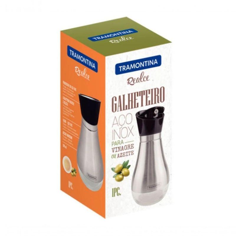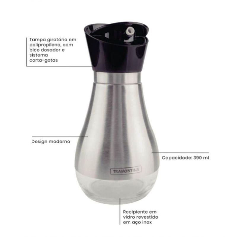Galheteiro Tramontina Realce 0,39 LitrosO galheteiro Tramontina Realce 0,39 litros é indispensável para quem não abre mão de ter a mesa itens que vão incrementar suas refeições e dar a elas muito mais sabor. Perfeito para ser utilizado tanto com vinagre quanto azeite, ele tem tampa giratória com sistema corta gotas e possui um design supermoderno. Além de todas essas características, ele é altamente durável e vai garantir muito mais praticidade para sua mesa!Recomendações de Uso:Modo de Uso: Use apenas sabão ou detergente e uma esponja macia. Outros tipos de produto como palha de aço, poderão riscar ou prejudicar o brilho das peças. Enxágue cada item a fim de remover totalmente os resíduos dos produtos de limpeza, que, por serem abrasivos, podem danificar o inox. Sempre que possível, use água quente, pois renova o brilho das peças. Após a lavagem, enxugue imediatamente as peças, caso contrário, as substâncias químicas da água (cloro) poderão causar manchas. Evite atrito entre as peças durante o processo de lavagem e no armazenamento, para mantê-las sem riscos. Evite o do produto com superfícies quentes, pois elas provocam a descoloração do material. Não guarde as peças em locais úmidos. A umidade também provoca manchas.Informações Adicionais:- Ideal para ir à mesa;- Recipiente em vidro revestido em aço inox;- Tampa giratória em polipropileno, com bico dosador e sistema corta-gotas.- Foto meramente ilustrativa.