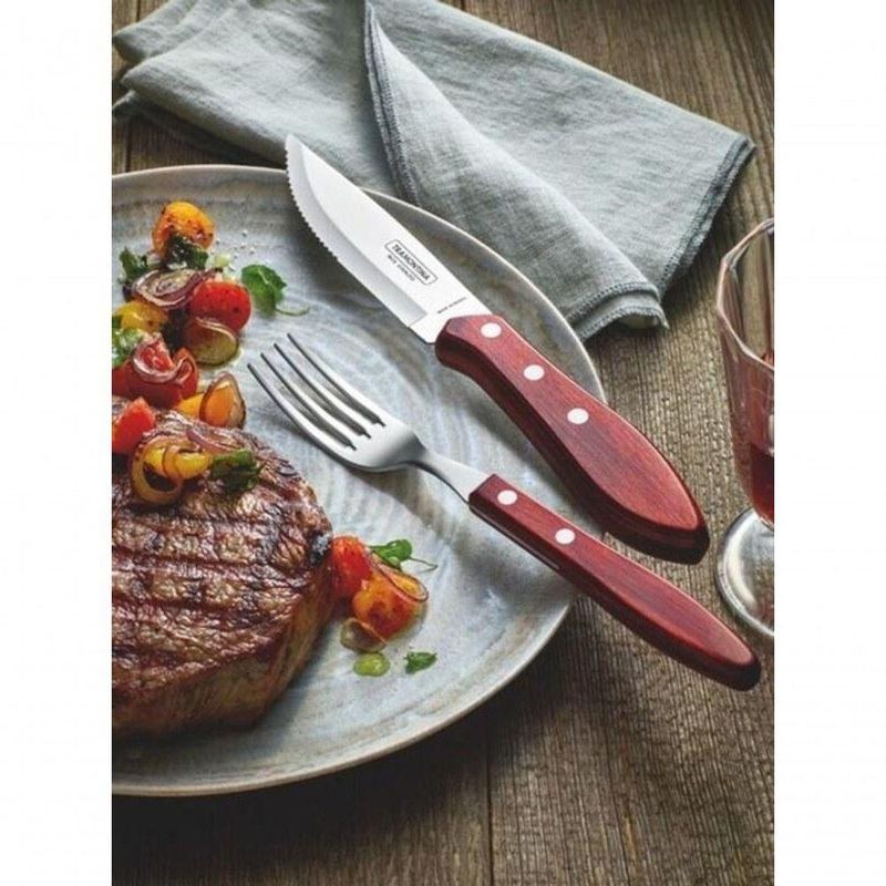 Garfo Jumbo Tramontina Churrasco Aço Inox Polywood VermelhoTalheres de qualidade deixam sua mesa muito mais convidativa. Um exemplo é a linha Polywood que, com seus cabos de madeira tratada, faz bonito em encontros mais informais.Recomendações de Uso:Antes do uso: Antes de utilizar o , remova as eventuais etiquetas e lave-o com água e de uso: Durante a lavagem use somente esponja macia, outros tipos de produtos, como palha de aço, poderão riscar ou prejudicar o brilho do aço inox. Enxágue bem a peça a fim de remover totalmente os resíduos dos produtos de limpeza, que por serem abrasivos, podem danificar o inox. Após a lavagem enxugue a peça, pois as substâncias químicas contidas na água poderão causar manchas. Sempre que possível use água quente, pois renova o brilho do talher. Evite o das peças com superfícies quentes, pois podem provocar a descoloração do produto. Quando usar a máquina de lavar louça, recomendamos retirar o talher logo que tenha terminado o ciclo enxaguar, a fim de que os mesmos sejam secados manualmente.- Tenha cuidado ao Manusear produtos cortantes e perfurantes e mantenha-os fora do alcance de crianças.- Foto meramente ilustrativa.Informações Adicionais:- A espessura do aço e a estampagem da lâmina garantem maior resistência ao produto, evitando deformações.- Cabo de madeira com tratamento especial, oferecendo maior durabilidade à peça.- resistente a impactos e a altas temperaturas.- Pode ir à máquina de lavar louças.- Permanece bonita por muito mais tempo.