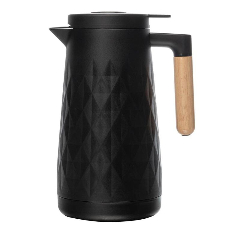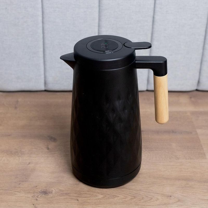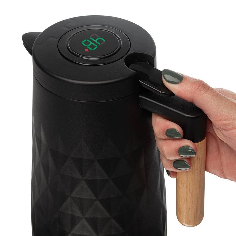 Garrafa Térmica New Diamond Preta da Lyor com termômetro digital. Capacidade de 1 litro, combina isolamento térmico eficiente com um design moderno que se destaca em qualquer ambiente.Seu corpo em plástico com acabamento diamantado traz sofisticação, enquanto o cabo de madeira natural garante conforto e segurança ao servir. Ideal para manter bebidas quentes por até 12 horas e frias por até 24 horas, é a escolha perfeita para cafés, chás ou sucos.O termômetro digital embutido na tampa permite acompanhar a temperatura com precisão, oferecendo mais controle na hora de servir. Funcional e decorativa, essa garrafa é indispensável na cozinha, escritório ou sala de estar.Capacidade de 1L: ideal para o consumo diárioIsolamento térmico: mantém quente por até 12h e frio por até 24hDesign New Diamond: corpo com relevo elegante e acabamento pretoTermômetro digital integrado: monitoramento prático da temperaturaCabo em madeira: toque escandinavo com conforto ao manusearCom a Garrafa Térmica Lyor New Diamond, você une praticidade, beleza e durabilidade em uma única peça. Sirva com estilo e mantenha suas bebidas na temperatura ideal por muito mais tempo!