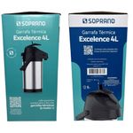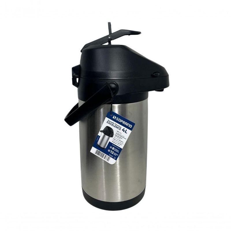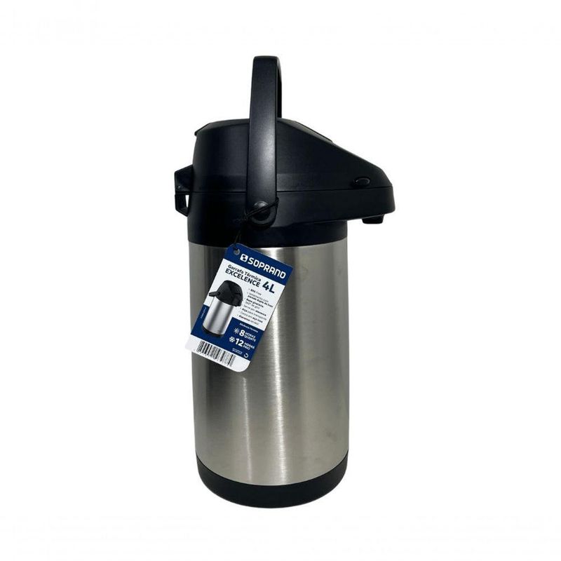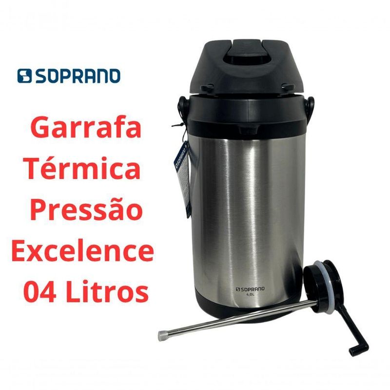 Garrafa Termica Pressão Inox Soprano Excelence 4 LtGarrafa Térmica Excelence 4L ? Soprano - Perfeita para grandes demandasAmpola interna em inox.Ideal para empresas, buffets, hotéis, restaurantes e eventos .Ótima para servir grandes grupos sem interrupções.Excelente opção para ambientes com alto consumo de café, chá ou água quente , como escritórios movimentados e salas de reunião.Desenvolvida para atender grandes demandas , a Garrafa Térmica Excelence 4L - Soprano oferece alta capacidade e excelente conservação térmica, tornando-se a escolha ideal para ambientes que exigem praticidade e desempenho superior.Grande Capacidade ? Com 4 litros, é ideal para eventos, escritórios, buffets e estabelecimentos comerciais , reduzindo a necessidade de reabastecimento.Acionamento por Alavanca ? Sistema seguro e eficiente, que facilita o serviço sem desperdícios.Conservação Térmica Prolongada ? Mantém líquidos quentes por até 8 horas e frios por até 12 horas, garantindo bebidas sempre na temperatura ideal.Durabilidade e Resistência ? Construção em aço inoxidável de alta qualidade, fornecimento robusto e longa vida útil .Versatilidade para Diferentes Aplicações ? Perfeita para hotéis, empresas, reuniões e qualquer ambiente com alto consumo de bebidas quentes ou frias.Principais características:Mais resistenteRevestimento duplo de inoxAcionamento por alavanca retrátilAlça para transporteBase Giratória, que permite servir 360ºCorpo em InoxAlavanca que impede o acionamento acidentalÓtima para tomar o chimarrão ou o tereré com a turma, por sua ampla capacidadeEficiência Térmica:- Quente: 8 horas- Frio: 12 horasOutras características:- Dimensões do produto: 26x18,9x37,7- Peso: 2,100kg- Material: Inox- Garantia: 90 dias para defeitos de fabricação- Código de referência: 09000.0071.61