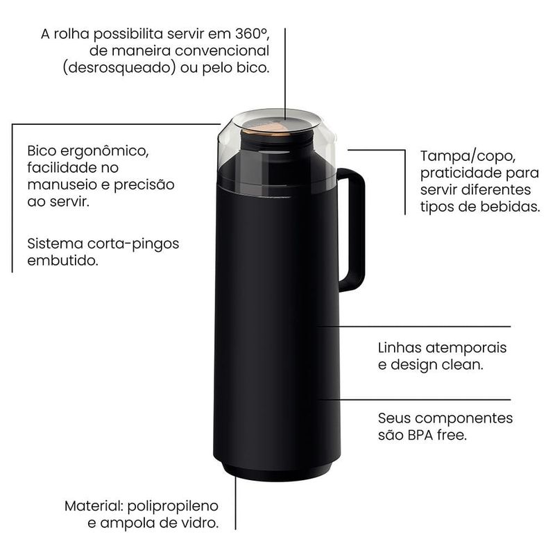 Gosta de degustar um café e chá quentinho ou um suco fresquinho durante o dia? Então conte com a Garrafa Térmica Tramontina Exata Preta de 1 L para conservar a temperatura ideal das suas bebidas por mais tempo. Ela possui ampola de vidro e corpo de polipropileno que a torna extremamente leve e fácil de manusear. Seu bico ergonômico com rolha proporciona precisão na hora de servir, podendo ser em até 360 graus ou de maneira convencional. Com design simples e moderno e vai ocupar menor espaço na hora de guardá-la ou durante o transporte!
